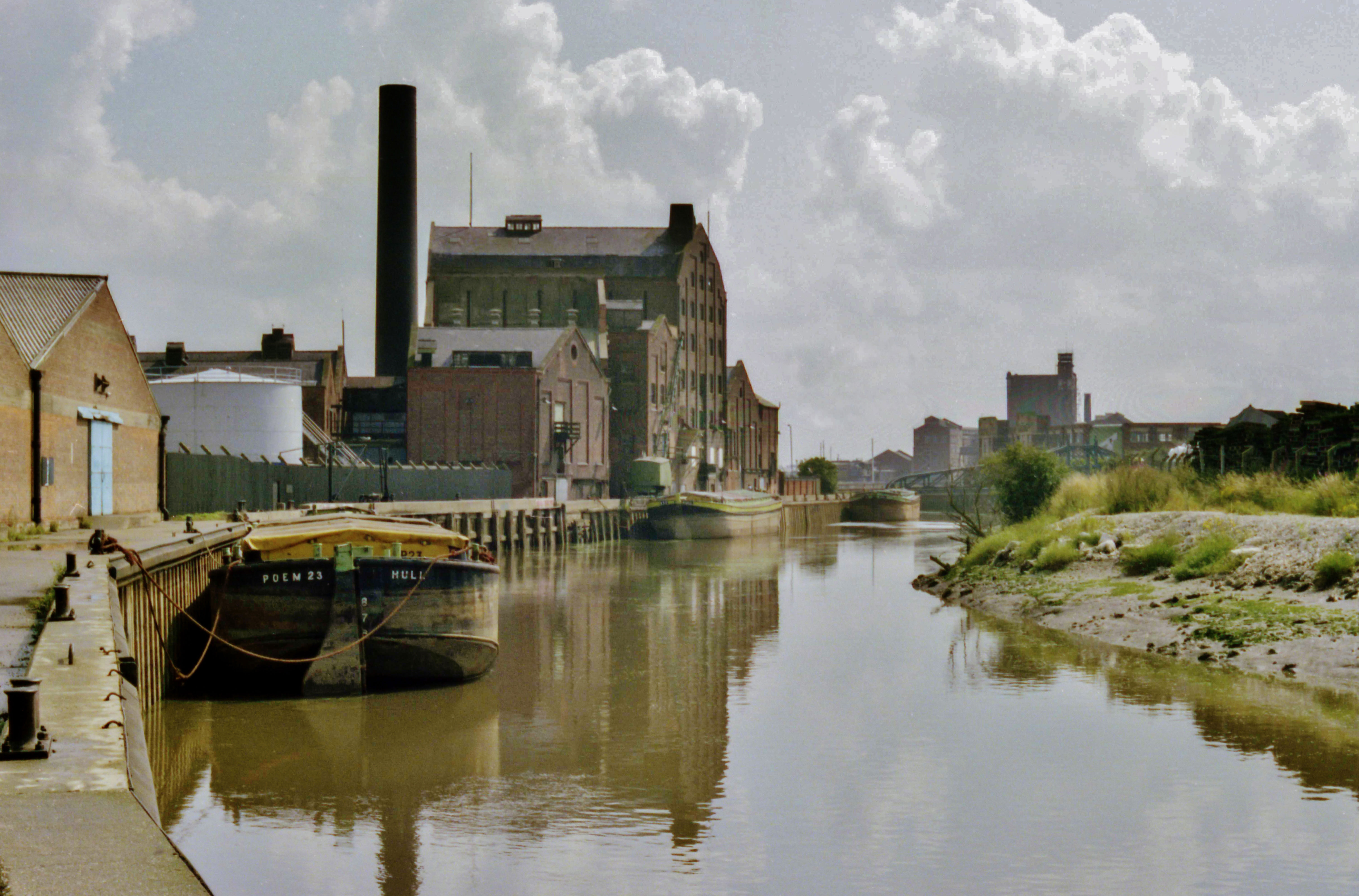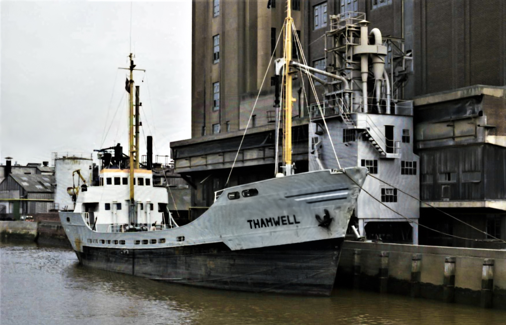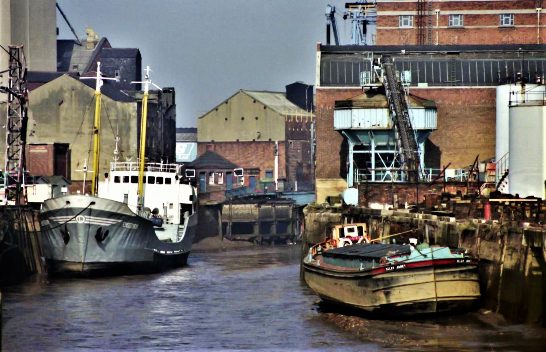 - River Hull, Kingston upon Hull, Sunday 8 August 1982. General cargo ship ‘Victress’ was built 1963 and renamed ‘Thamwell’ in 1981. The vessel is moored at Spillers Mill, Cleveland Street. Following war damage, the mill was rebuilt in 1950. It was closed in 1983 and demolished in 2007.