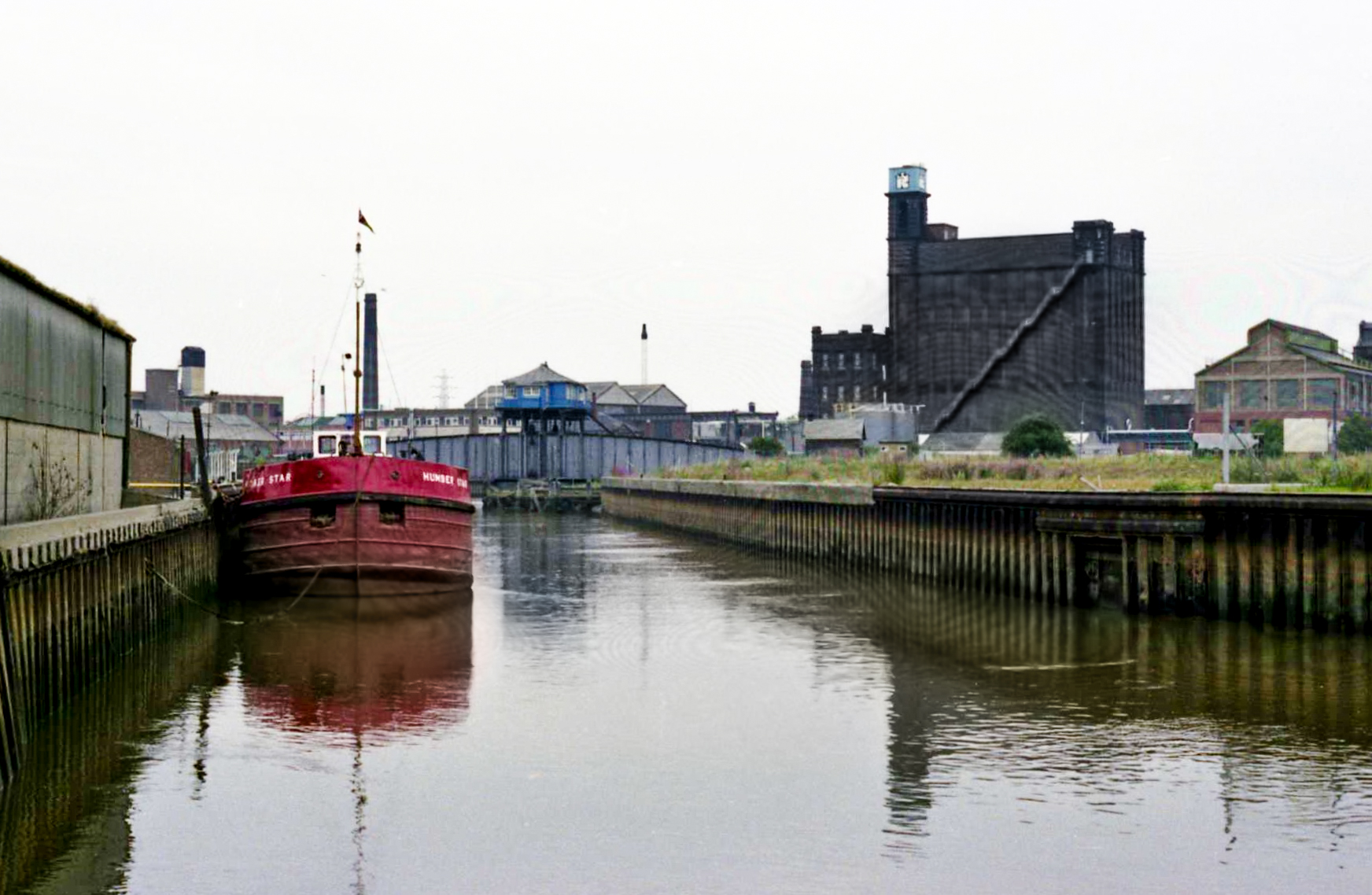 - River Hull, Kingston upon Hull Sunday, 8 August, 1982. The barge ‘Humber Star’ at moorings near the former Wilmington rail bridge, now for pedestrian/cycle use only. Viewed from the wharf near George Mansell’s premises.