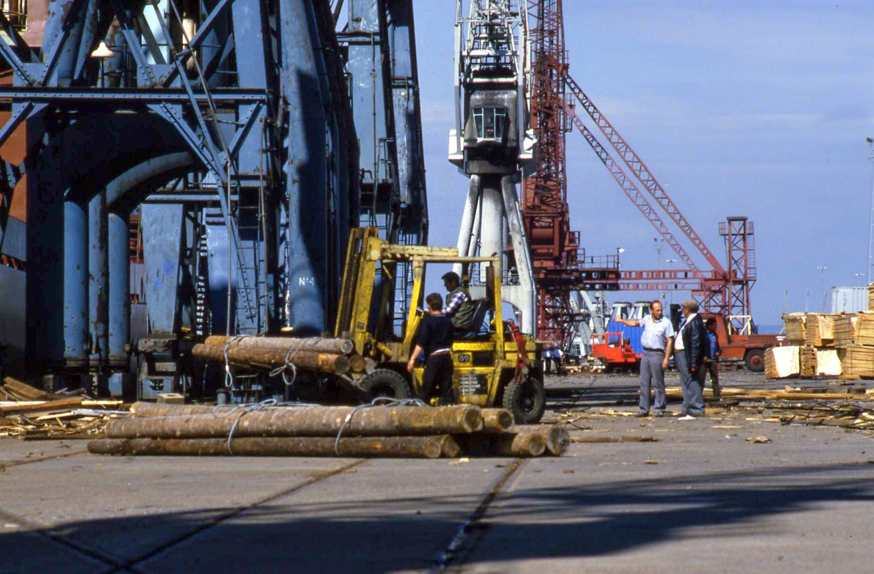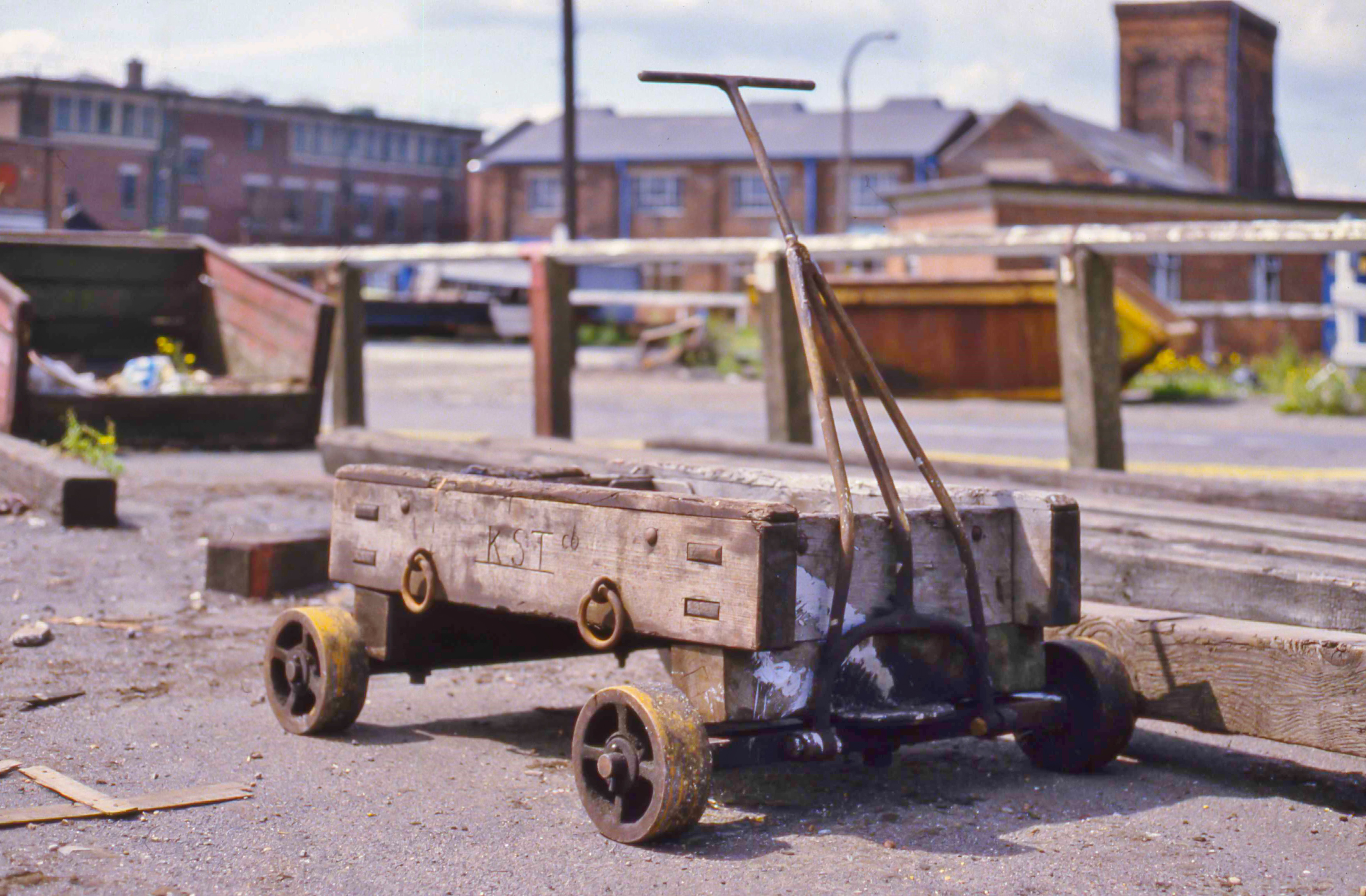 - William Wright Dock, Kingston upon Hull, Sunday, 7 July, 1985. On the quayside of the dock is what maybe a rully, a four-wheeled cart used in the movement of heavy goods. The operator was called a rullyman. The inscription ‘KST Co.’ is etched into the side of the rully, presumably indicative of the owner, as yet unidentified.