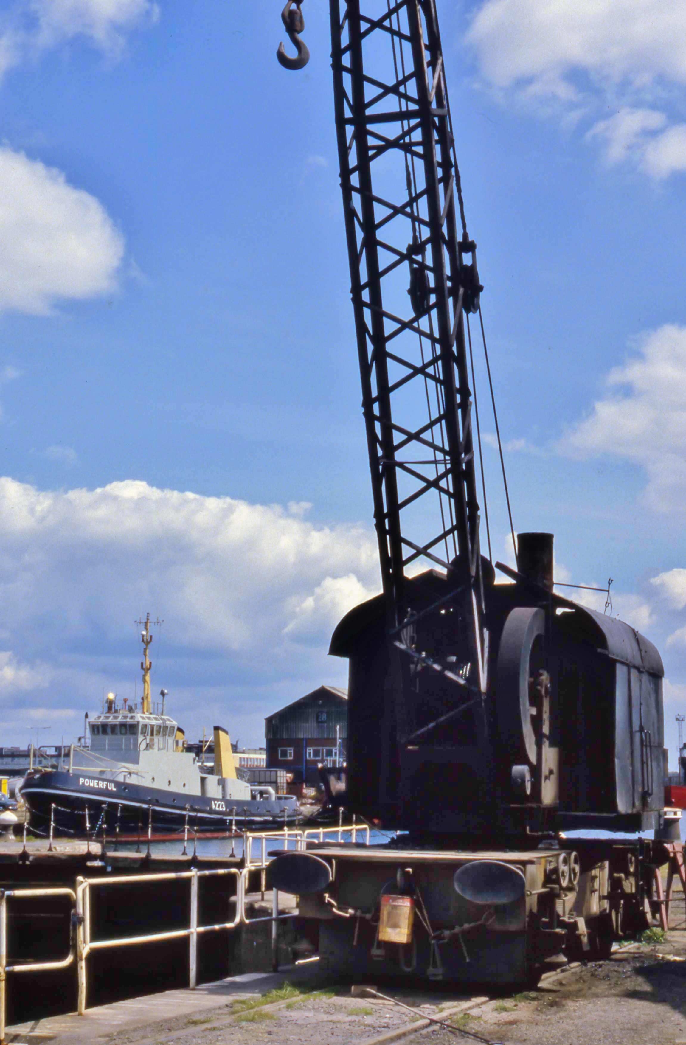 - William Wright Dock, Kingston upon Hull, Sunday, 7 July, 1985. Travelling crane at the graving dock. At left, ‘Powerful A223’, Adept class tug, launched 1985, Royal Maritime Auxiliary Service (RMAS).