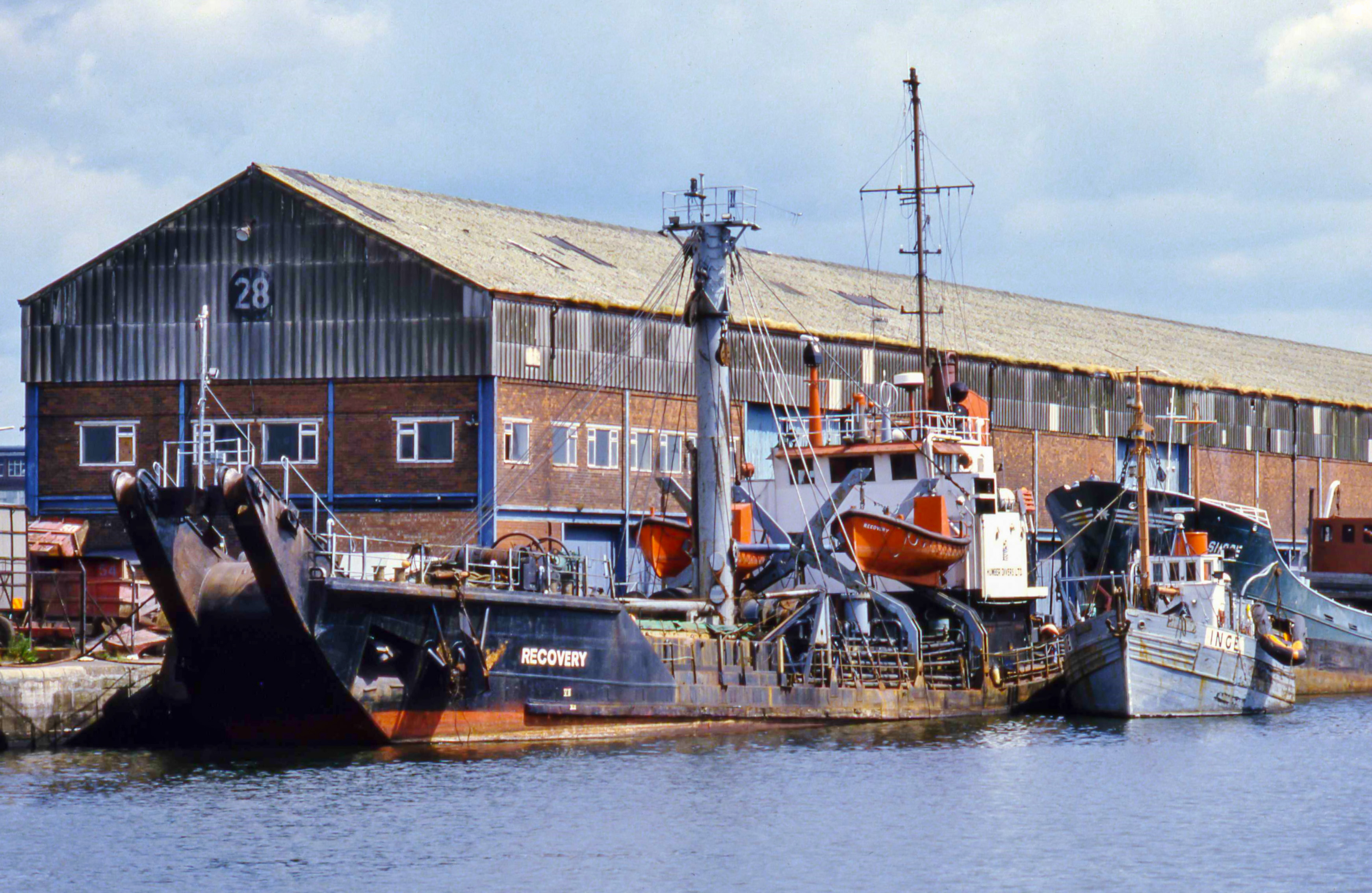 - William Wright Dock, Kingston upon Hull, Sunday, 7 July, 1985. Alongside No.28 shed, ‘Recovery’, operated by Northern Divers (Eng) Ltd., established 1963 as the U.K.’s leading underwater engineering service. Based in Kingston upon Hull.