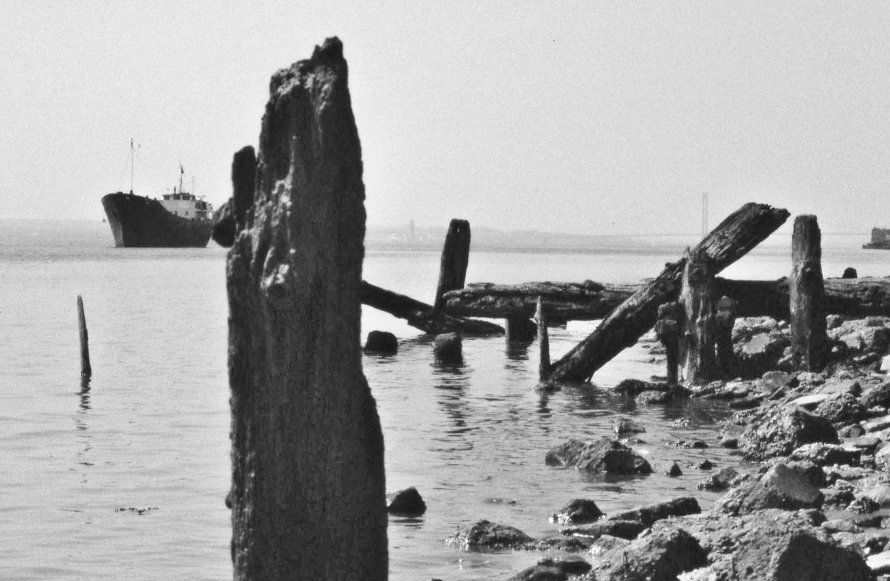 - Humber Estuary, Thursday, 7 May, 1987. Derelict piers on the Humber foreshore adjacent to the ABP (Associated British Ports) workshops. Looking towards the Humber Bridge.