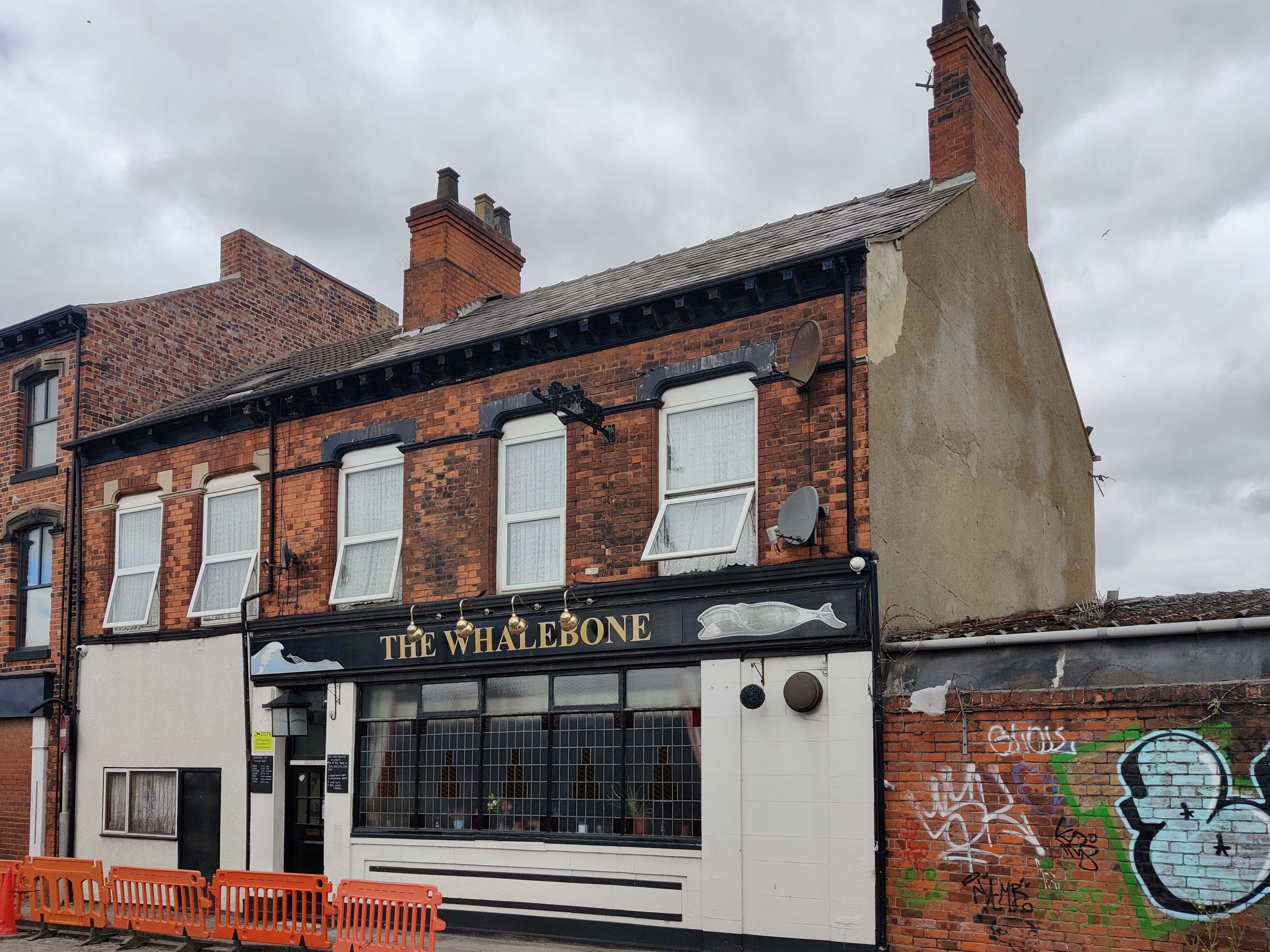 Although Scott Street Bridge had gone the wooden dolphins protecting the bridges steelwork and mountings were still there. Beyond, the river curved as it went upstream to the north. I could see more old mill buildings. A covered bridge went from one of the riverside mills into the grain silo which had been R&W Pauls. I passed the Whalebone Inn, a black and white pub that on closer inspection was a serious drinkers pub with awards and cask ales.