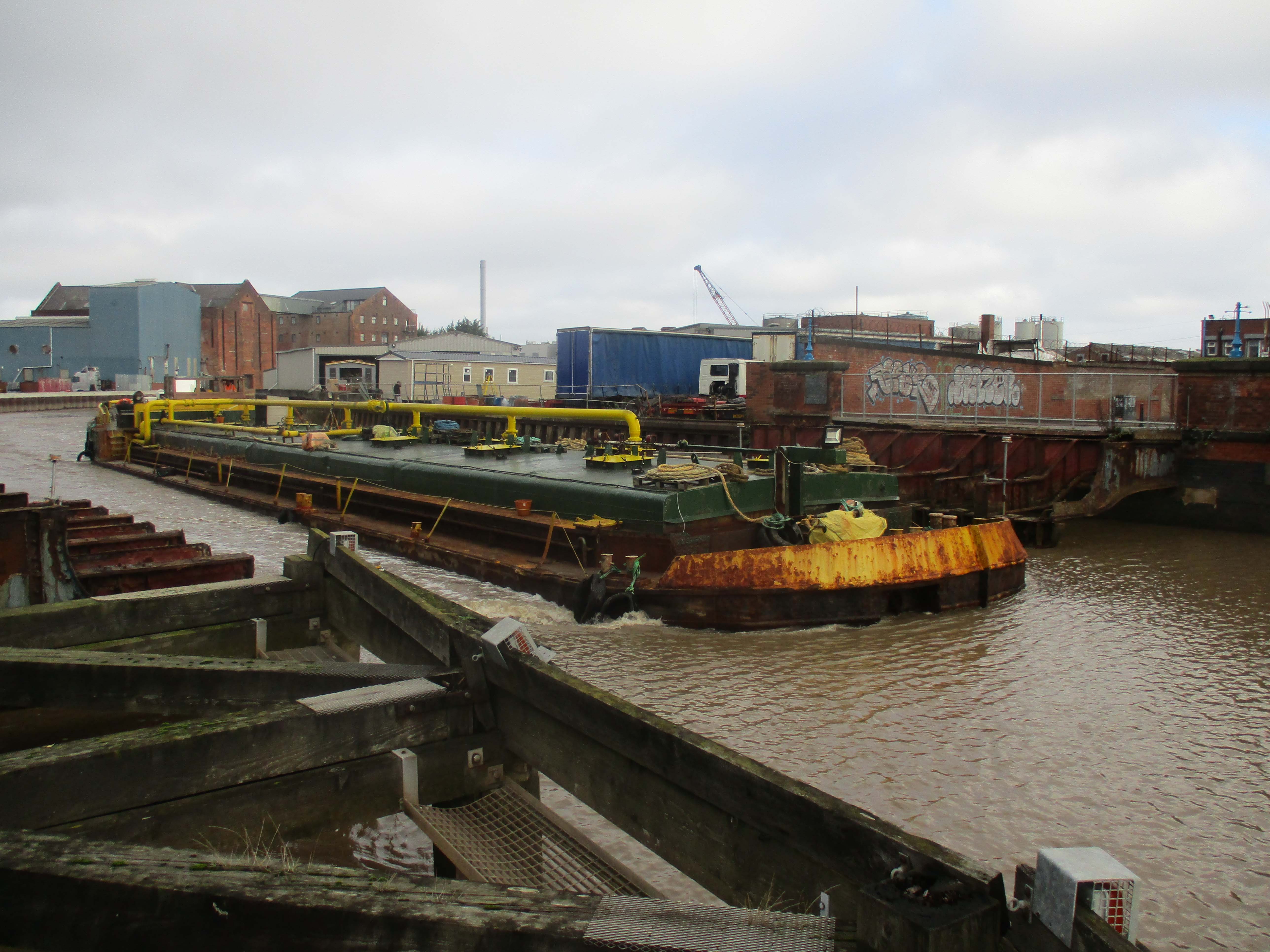 I then went down Cumberland Street to get to Eagles Bight. I did think about going to Sculcoates Bridge but the environs there are mostly modern processing works and I didn’t think that they would be too photogenic. I went straight to Scott Street as the last time I had only got going away photos and I wanted photos showing all the old wooden protection piers and the remains of the bridge. It wasn’t long before Swinderby came into view, but the sun had gone. I managed to get approaching and going away photos.