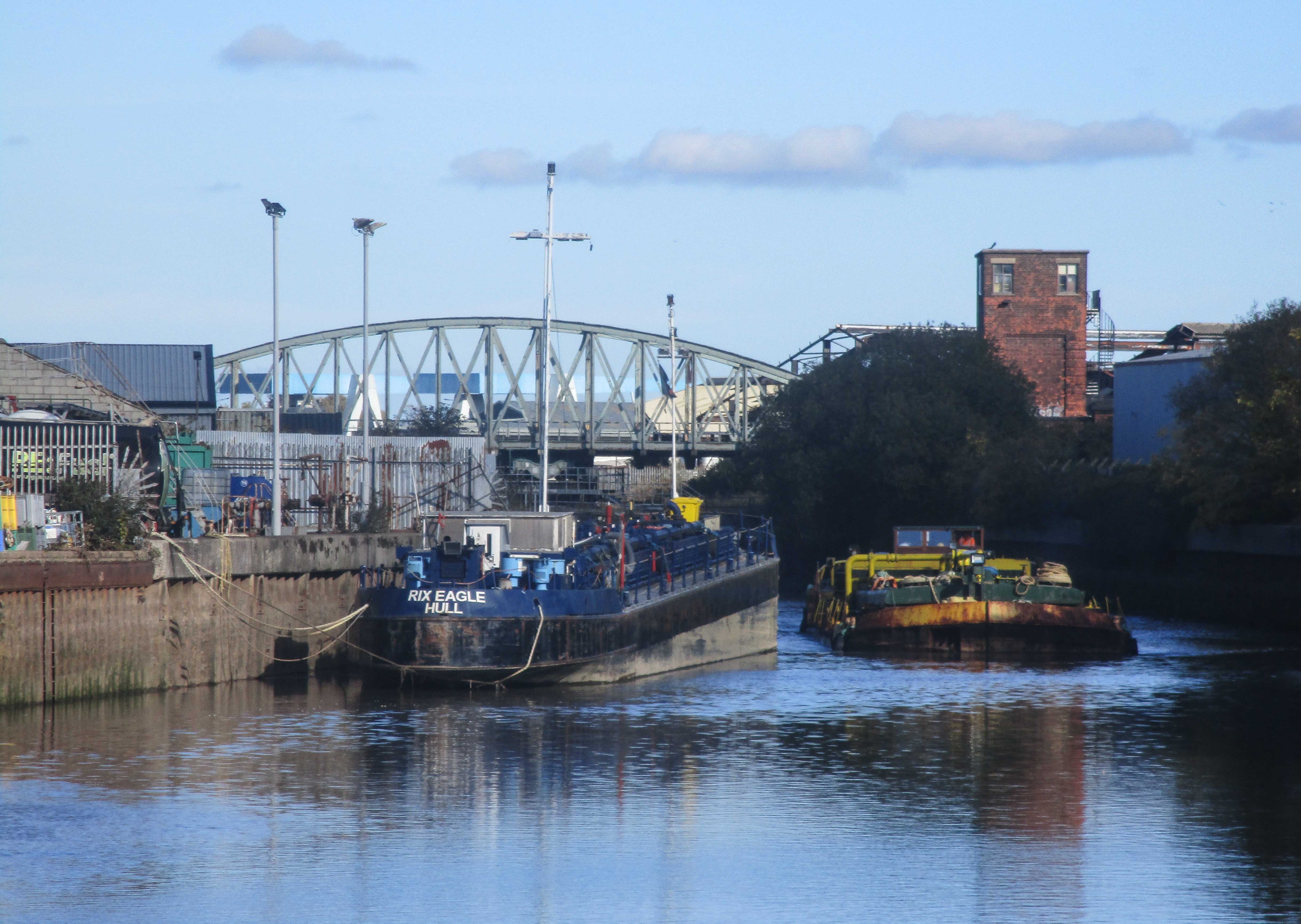 Pete Bayley was in his office at Drypool and said that the crew had already moved Paragon and would be setting about leaving with Swinderby. I walked quickly up Wincolmlee and sensed something was going on when I could see a bridge man in hi vis jacket up by Wilmington bridge waving his arms by the road junction. Sure enough Swinderby was already past the bridge which had been put back to its closed position already and it was moving by Rix’s depot. I dashed into the car park I had used on 18th October and in nice sun got the first handful of shots on camera, noting that the barge was going a bit faster than my last visit.