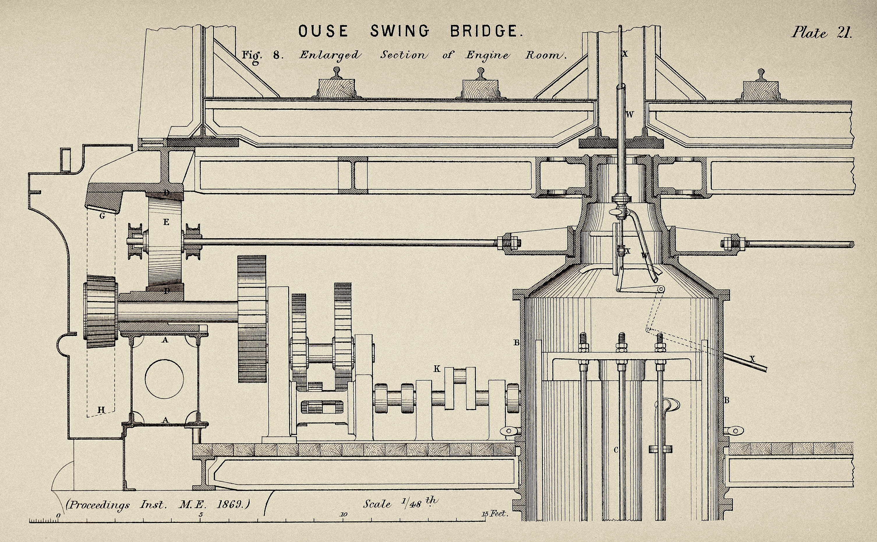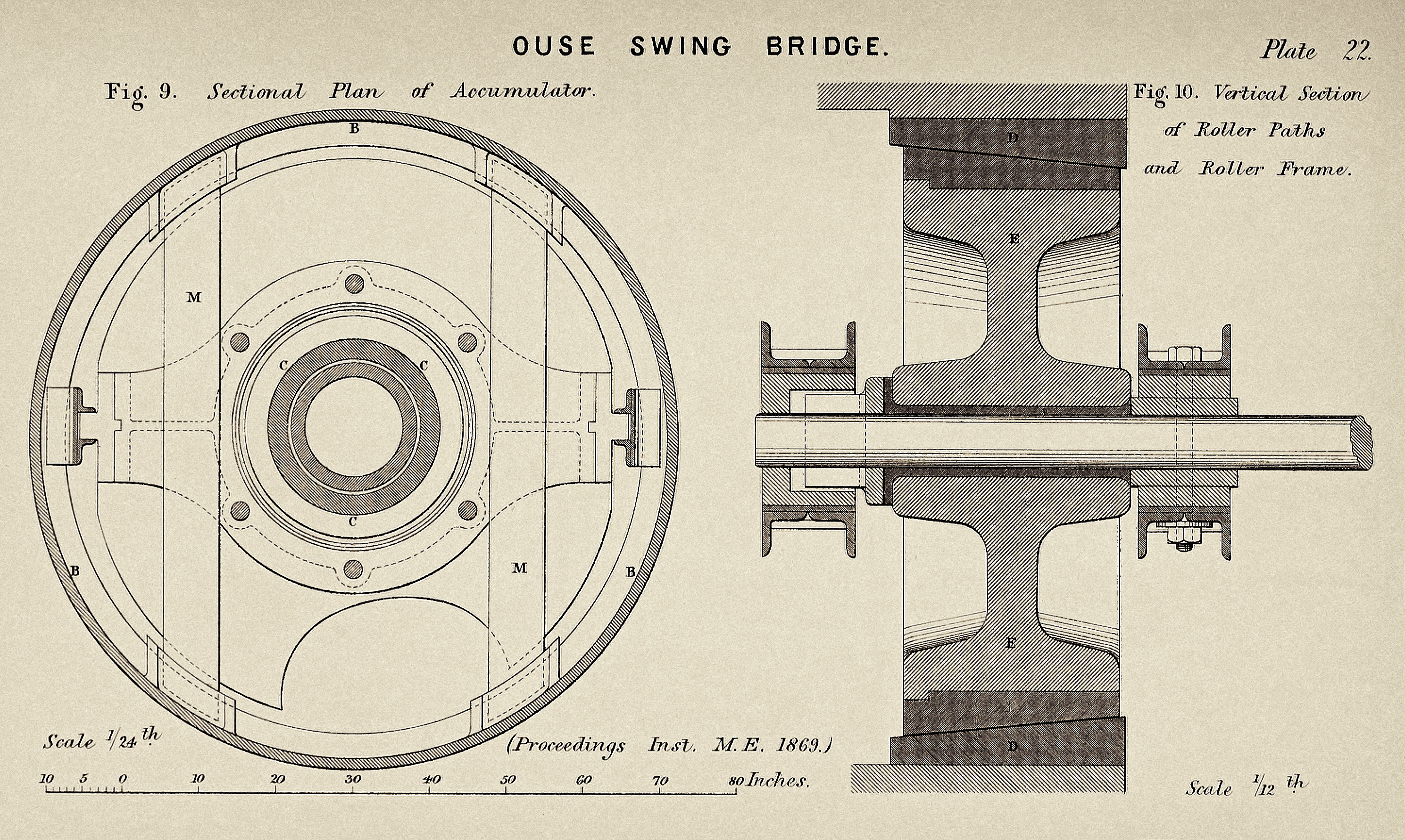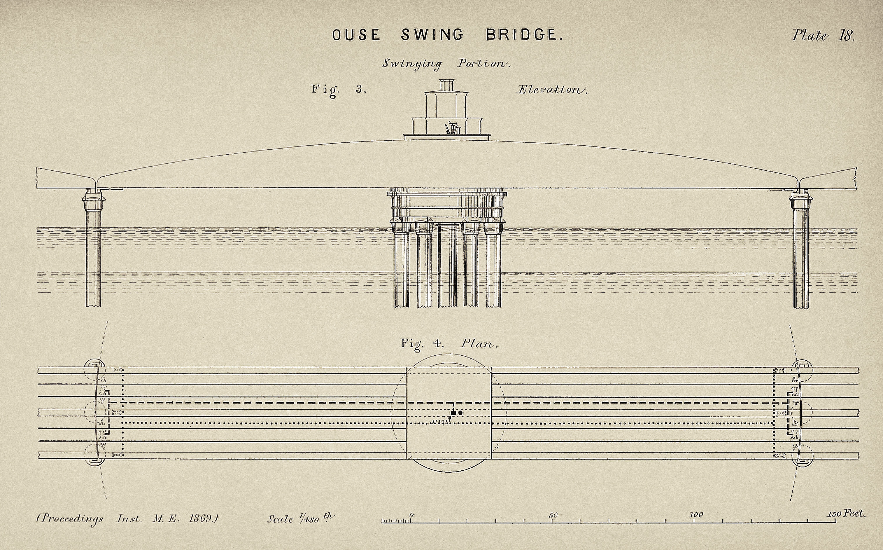 This post has been transcribed from the published minutes and meeting of the Institution of Mechanical Engineers chaired by William Armstrong in 1869. Sir William describes his hydraulic design and construction of the brand new railway swing bridge built over the River Ouse at Goole for North Eastern Railways’ network link to Hull. I’ve transcribed the proceedings in full and restored all of the original plates of the bridge, published here. You can click on the images to enlarge the plans to have a closer look.