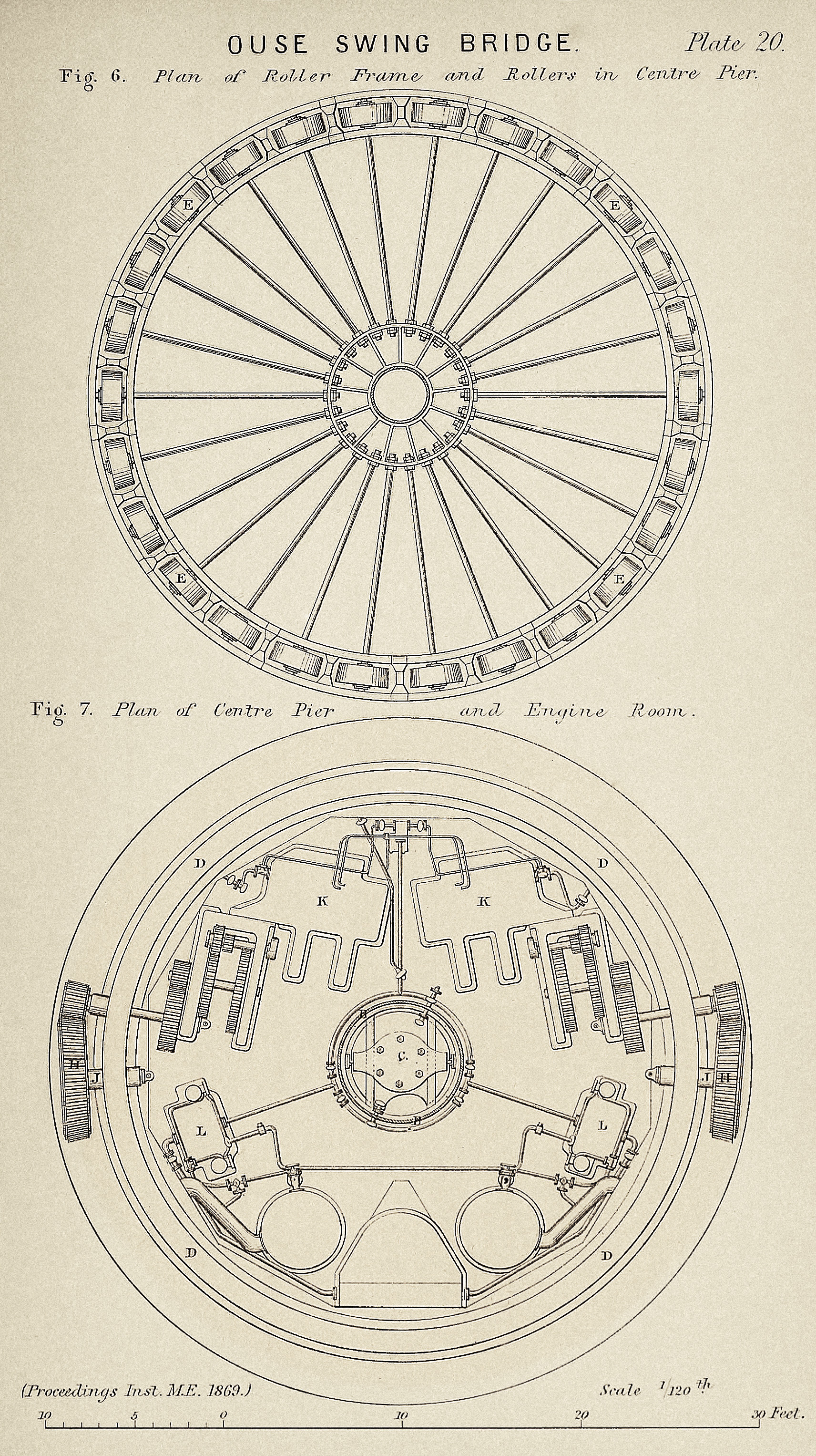 The weight of the swing bridge is 670 tons. There is no central lifting press, and the entire weight rests upon a circle of conical live rollers E E, Figs. 5 and 8. These are 26 in number, as shown in the plan, Fig. 6, Plate 20; they are each 3 feet diameter with 14 inches width of tread, as shown in Fig. 10, and are made of cast iron hooped with steel. They run between the two circular roller paths D D, 32 feet diameter and 15 inches broad, which are made of cast iron faced with steel; the axles of the rollers are horizontal, and the two roller paths are turned to the same bevil.