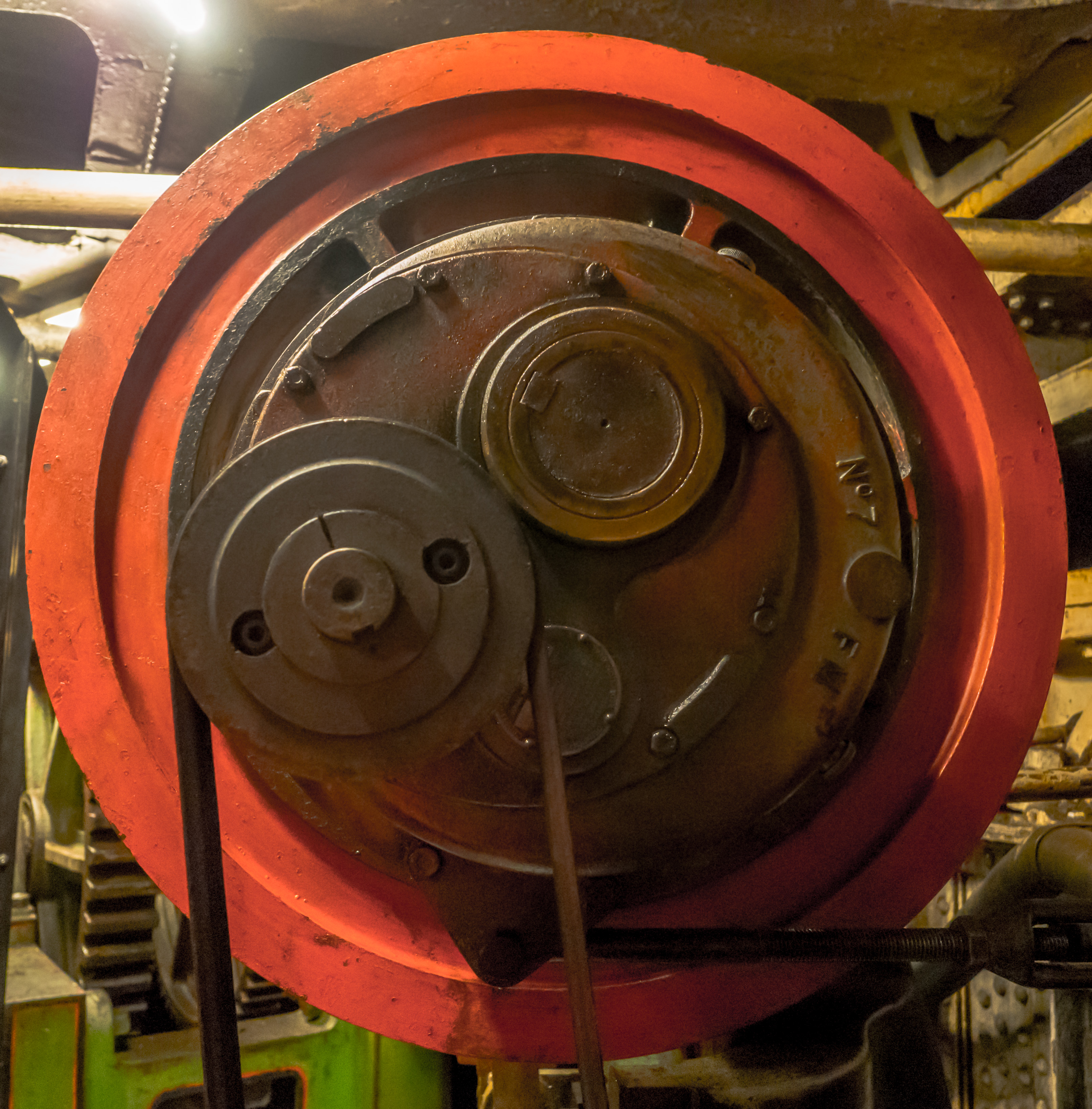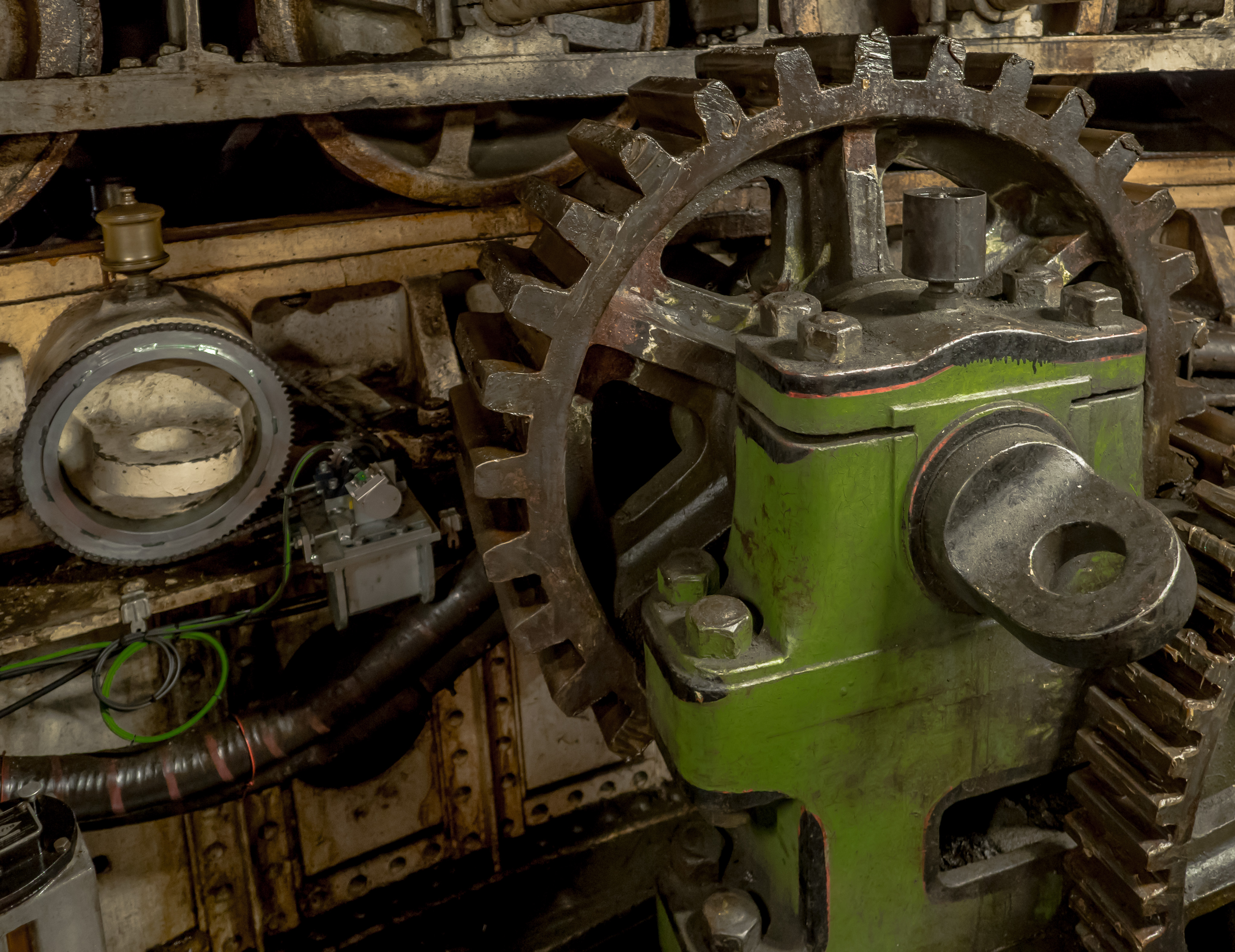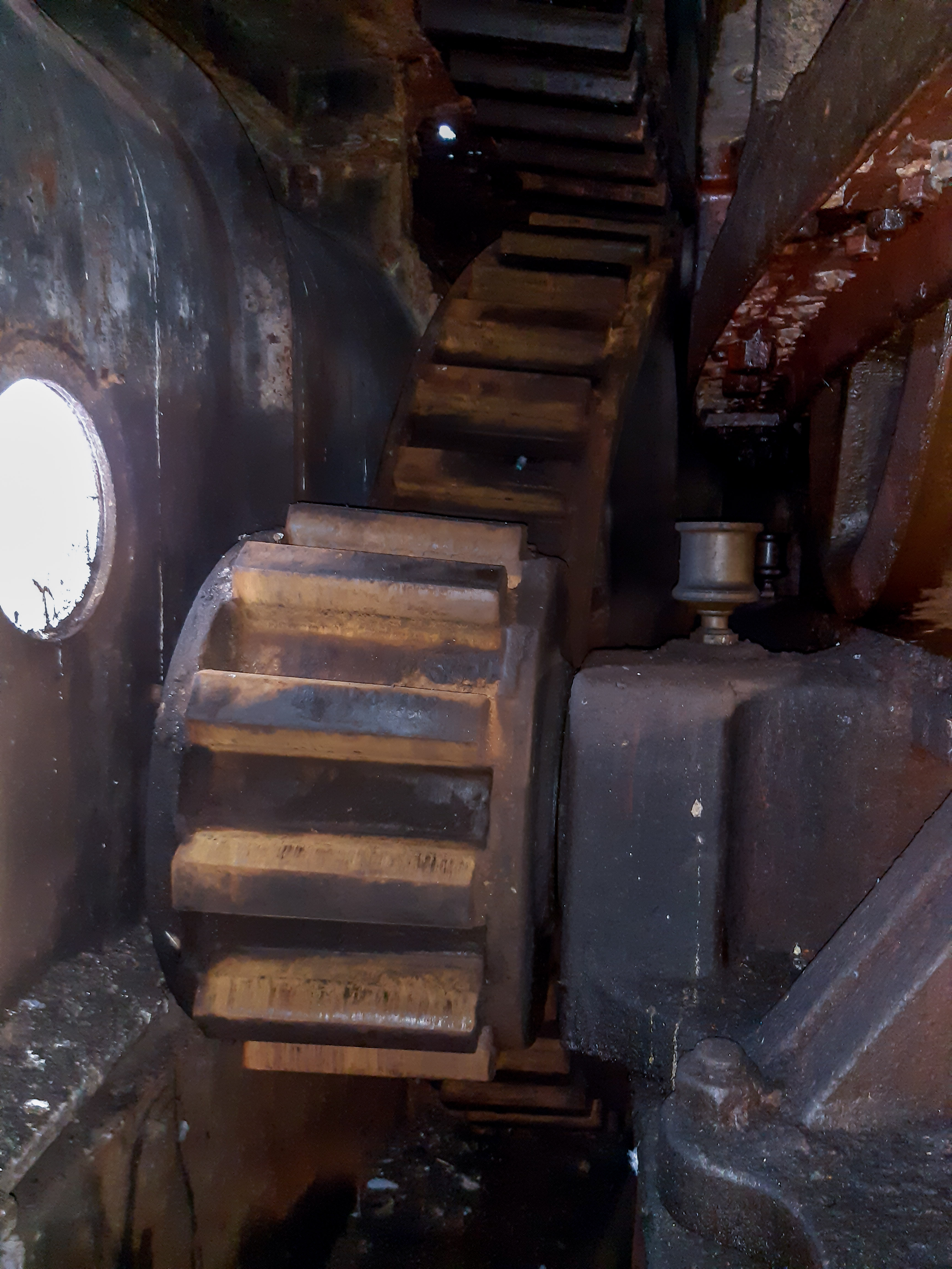 Photo 4 – One of the two open sets of gearing that steps up the torque between the Turning Engines and the final Pinion Gear and Drive Wheels that are exterior to the engine room that operate against the rack on the swing part of the bridge.