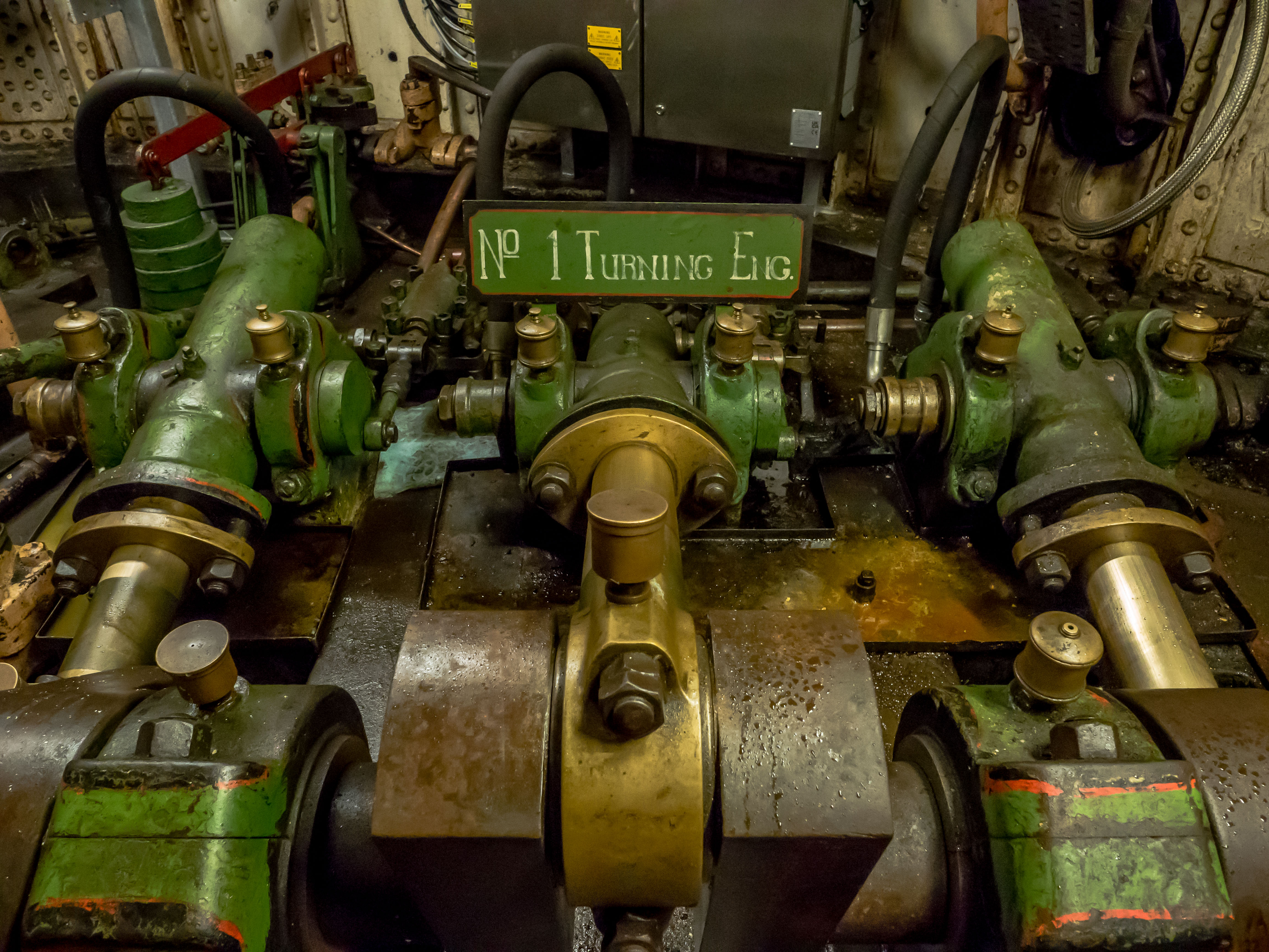 Photo 3 – One of the two original Three-Throw Pumps. (Item L in Plate 20, Fig. 7) that recharges the Accumulator that provide the hydraulic power (pressurised oil) to the engines and bridge jacks and associated equipment.