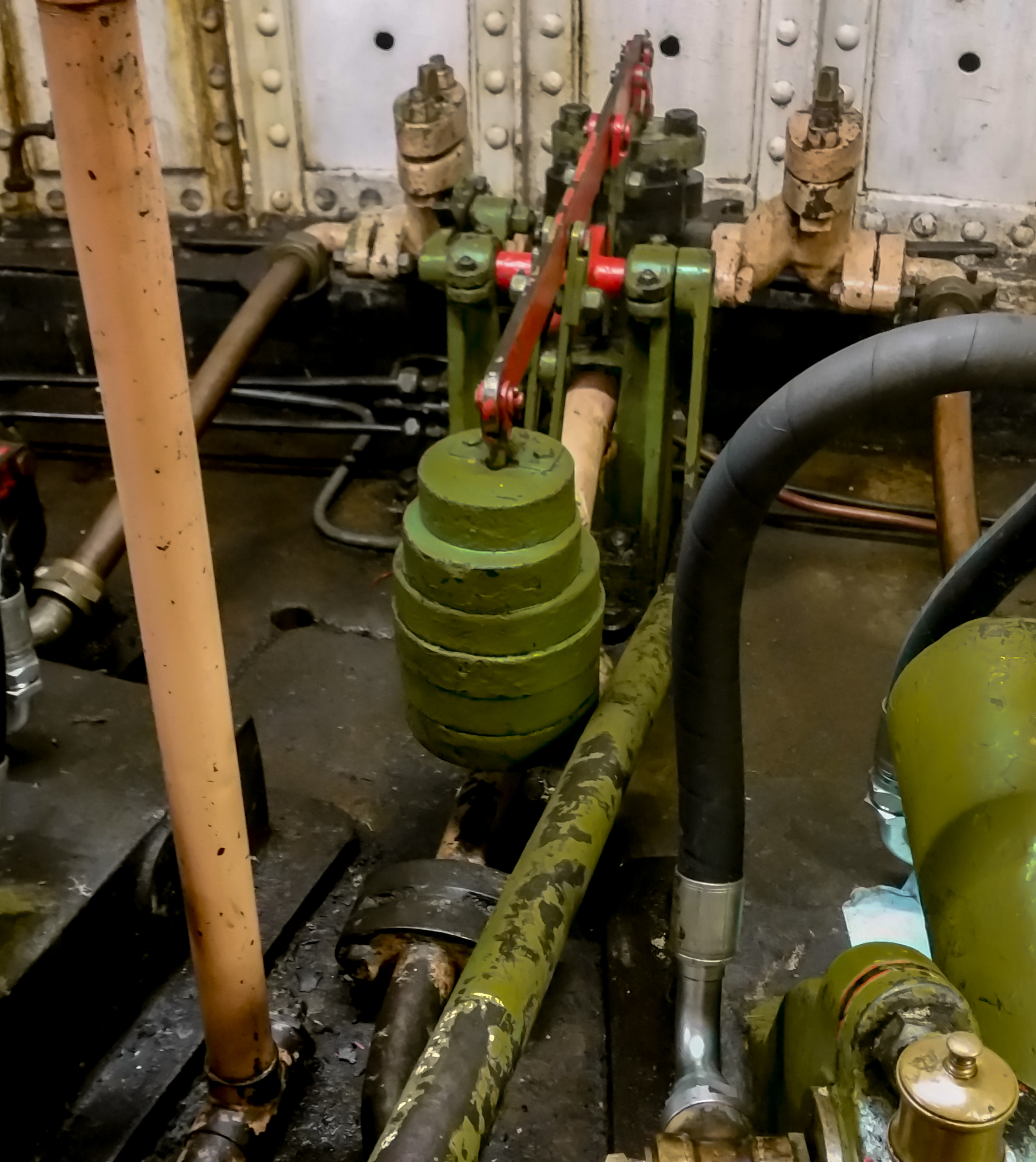 Photo 7 – (I have attached another photo 7a above right, better showing this valve). The original engine control valve which controls either of the two original engines. It is operated only by small longitudinal movements of the green control rod. The initial movement of this rod in one direction initially operates a valve, sending pressurised oil from the accumulator to a separate valve which selects the engine direction, forward or reverse. Continued movement of the rod in the same direction then opens the main feed valve to the engine cylinders allowing progressively more flow of pressurised oil to the engine cylinders, thereby increasing the power.