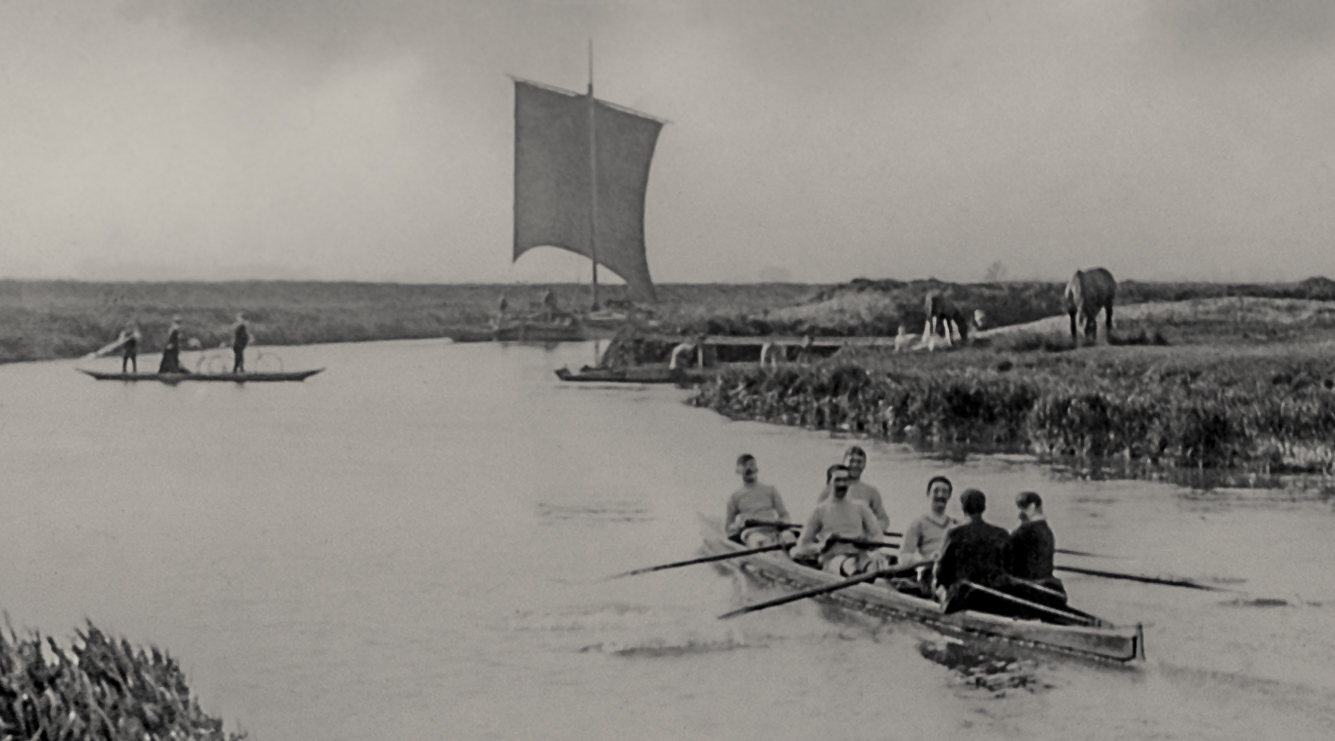 The rowing boat is coming in a not too distant second as the first can just be seen heading up the landing on the east bank – with the coxswain throwing a derisory glance back at the photographer, much to the amusement of the rowers who seem more than happy to be the subject of the latest technological craze.