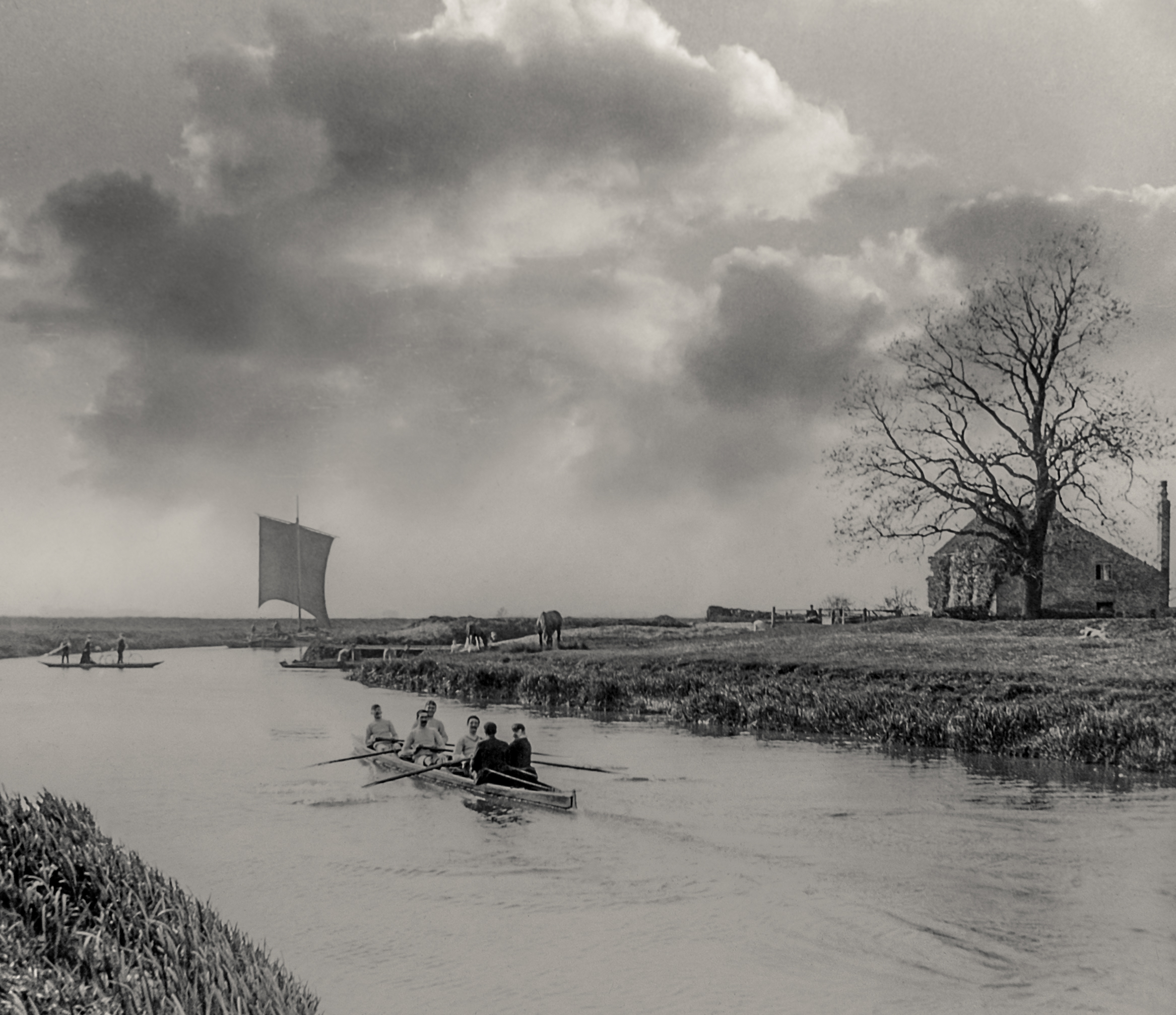 Further up river a Humber Keel heads north towards Beverley. Between them the ferry punt carries a couple and their bicycles across the river from Ferry Lane to Wawne. To the right of the frame a farmer has whistled his dog, the terrier is bounding so fast it’s taken to the air.