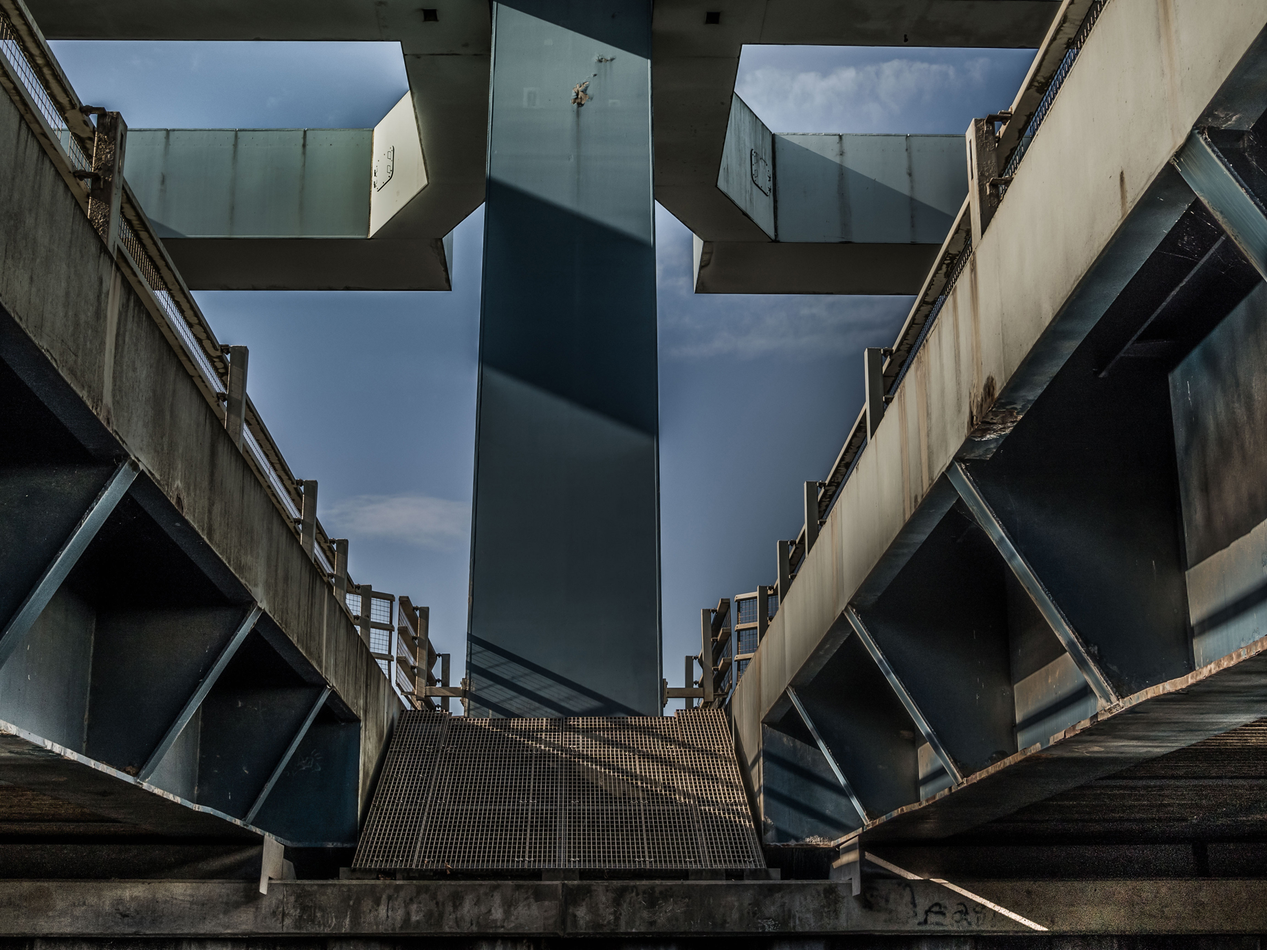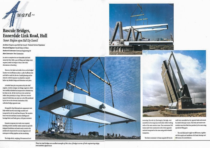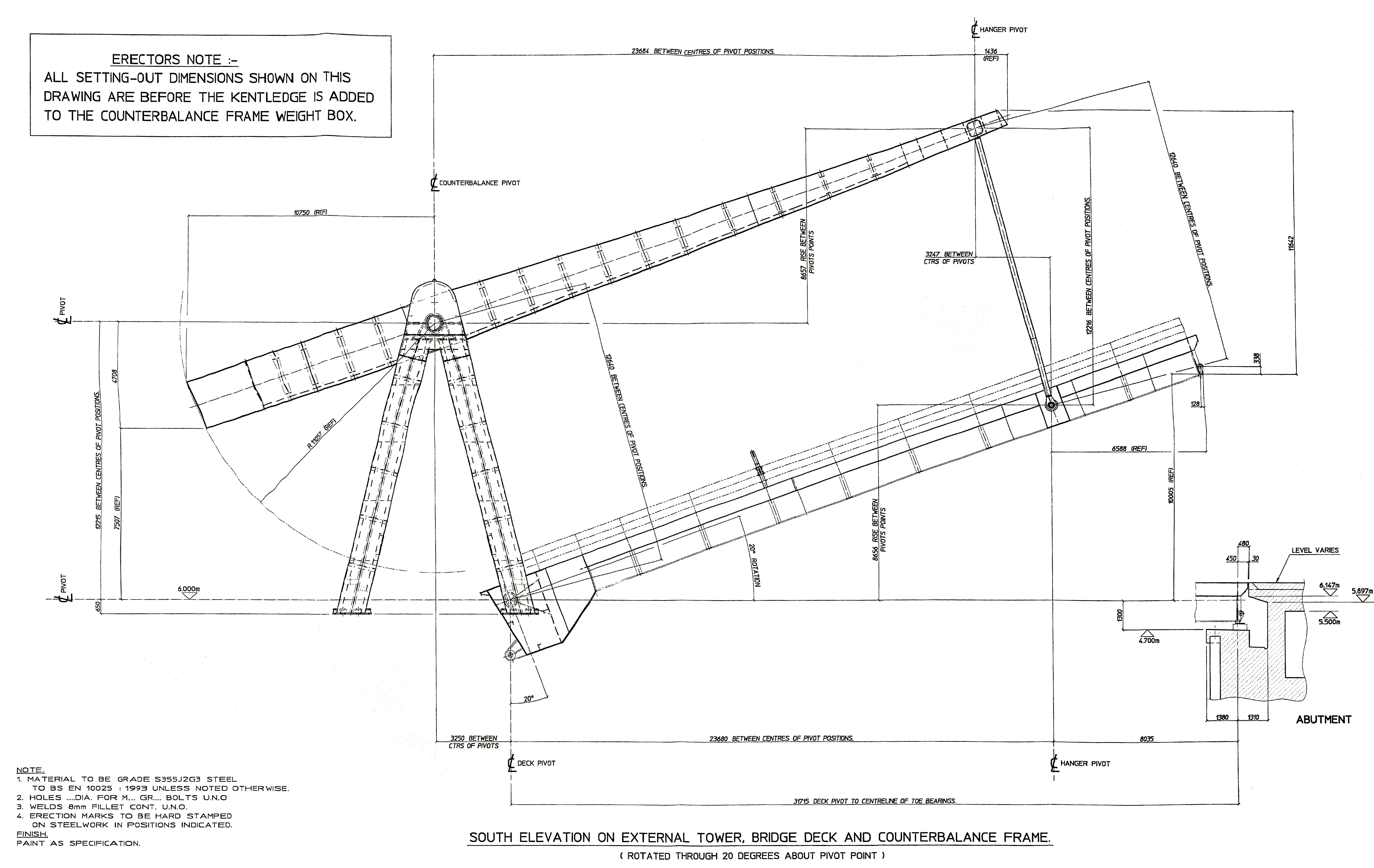 Fortunately, if you like bridges, the works hit a spring, created a lagoon and the crossing resorted to an over the river construction of a pair of lifting road bascule bridges, similar to Stoneferry, the bridge decks each weighing 270 tonnes with the counterbalance arms 140 tonnes each.