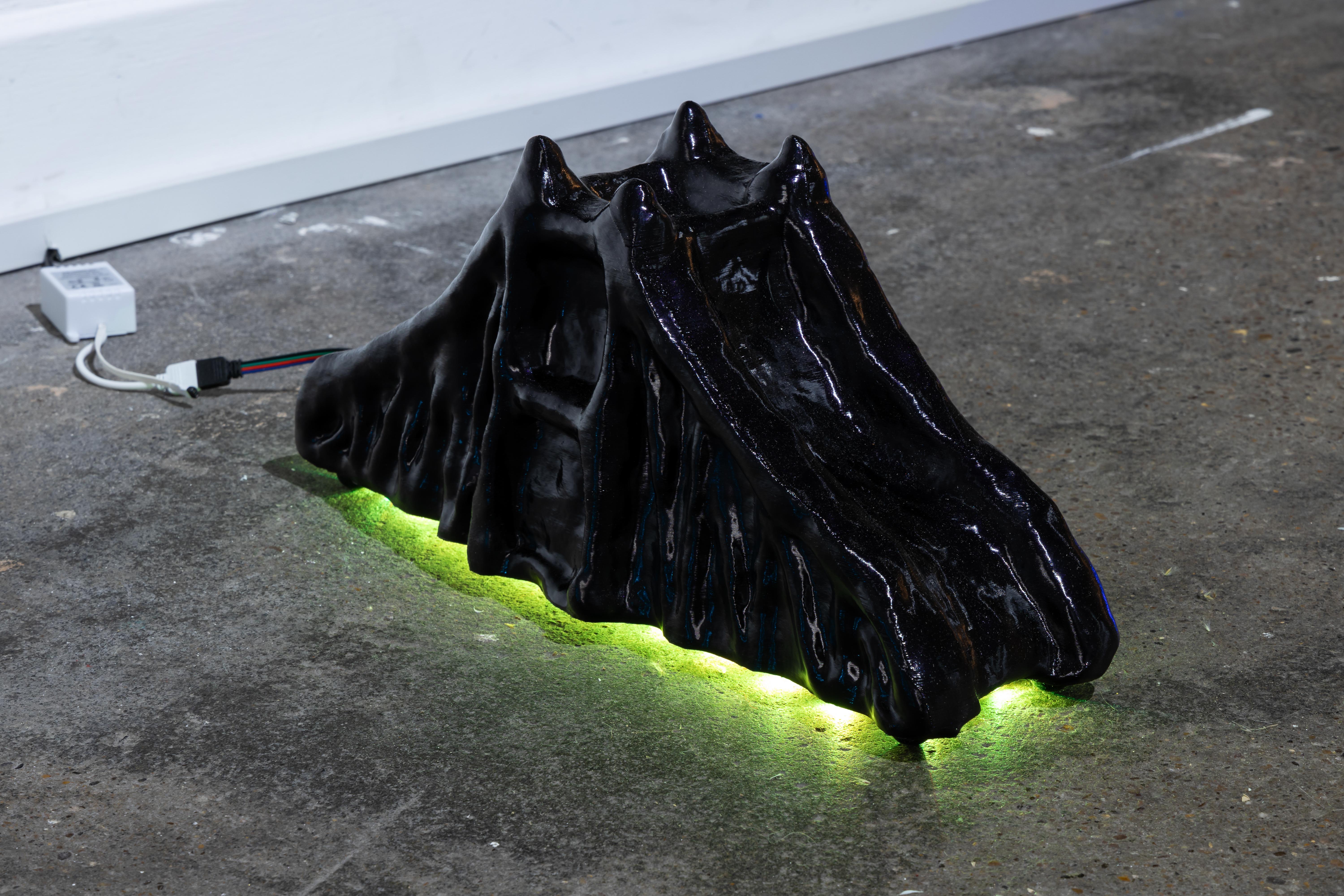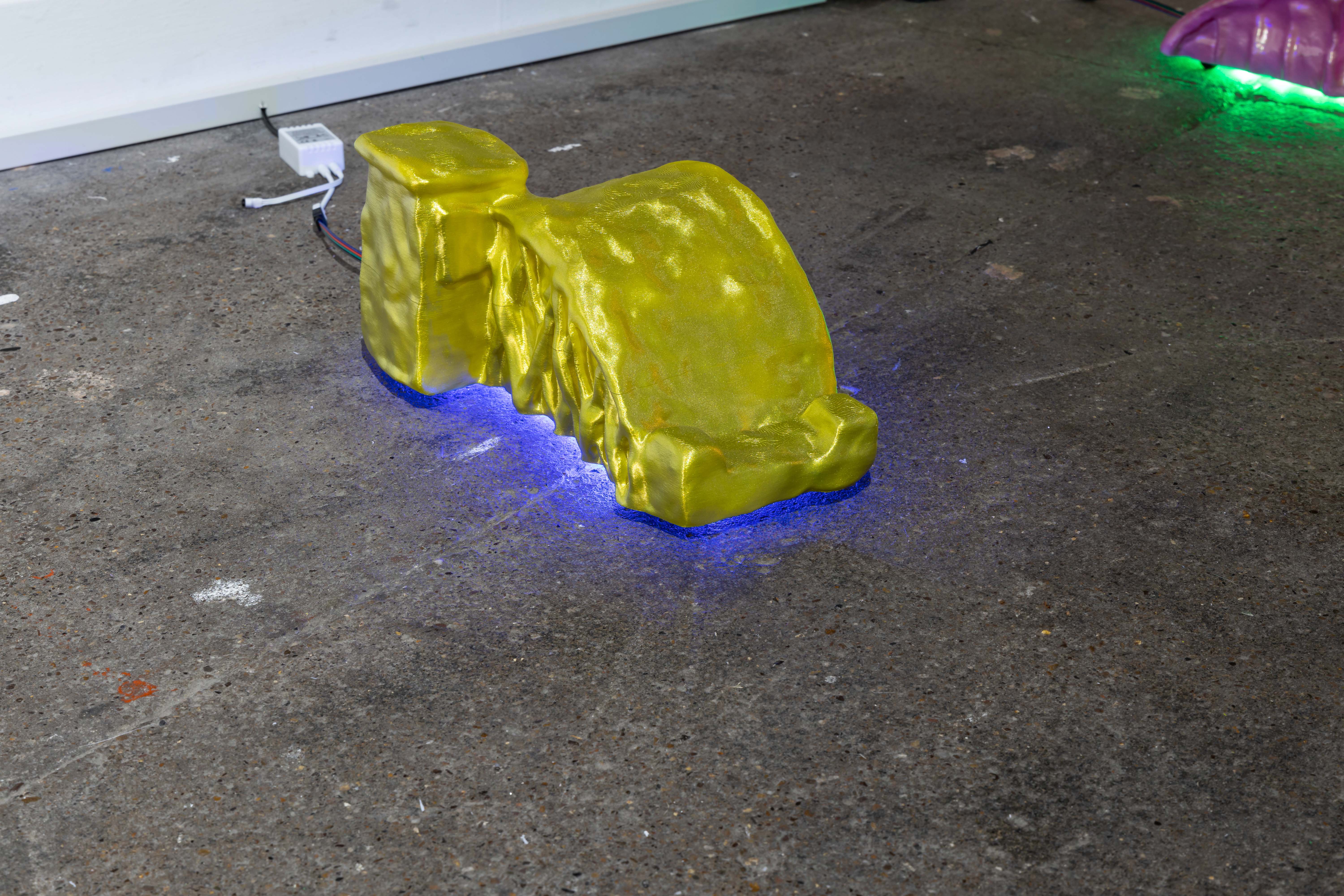 “Epochs continue to collide in a series of six shoebox-sized sculptures depicting Hull’s cast-iron bridges, including two now-demolished structures. To those familiar with the area, these 3D models are instantly recognisable, though reconceptualised with vibrant automotive paint and LEDs. Pell transforms the rigidity and coldness of these industrial structures to resemble customised cars with underglow lighting. Here, the familiarity and knowledge of one’s hometown – even of the very structures beneath our feet – is presented as in a state of flux.” – Megan Jones: Byland’s Super Saga – review, Corridoor8, 01.06.2024