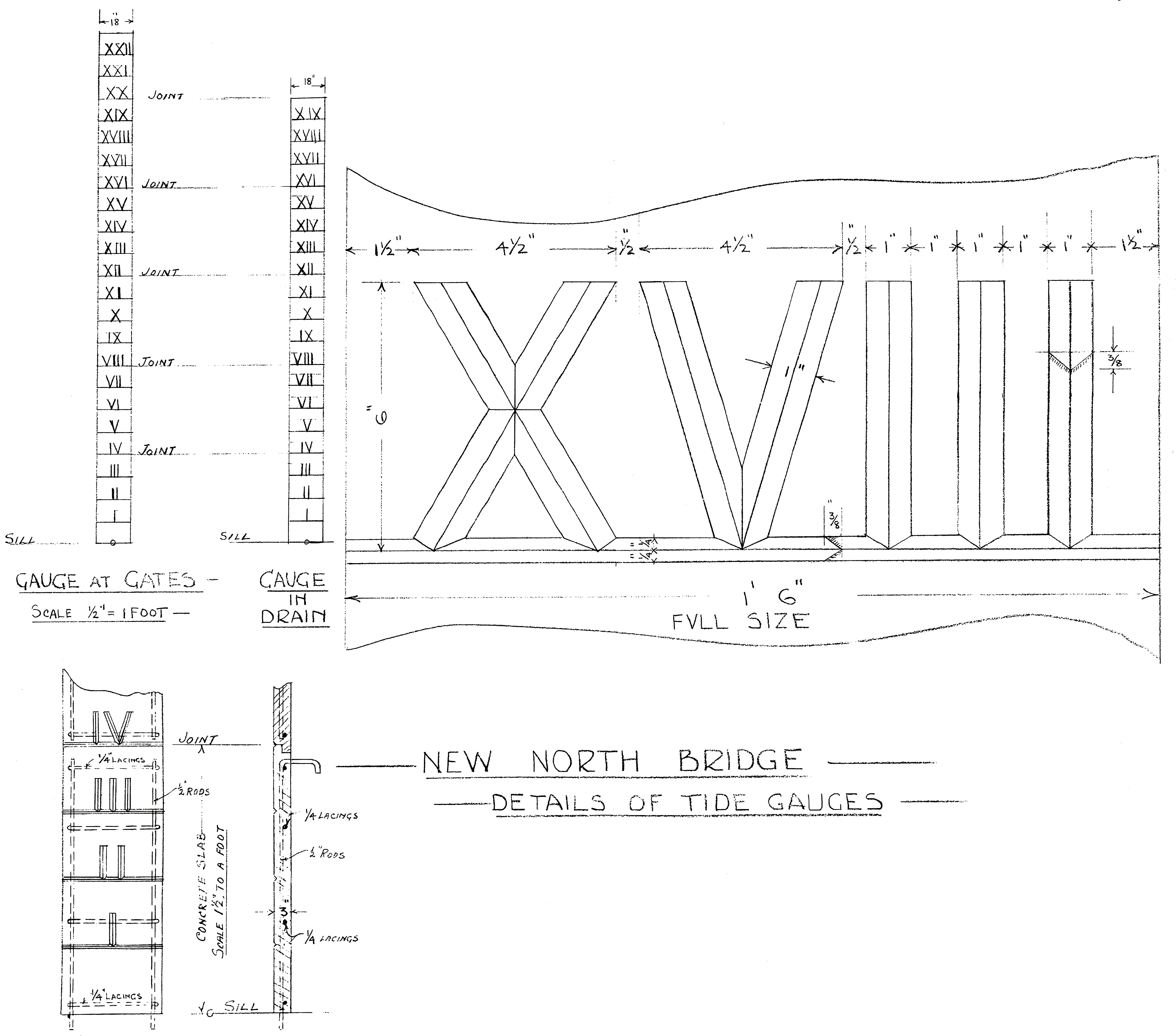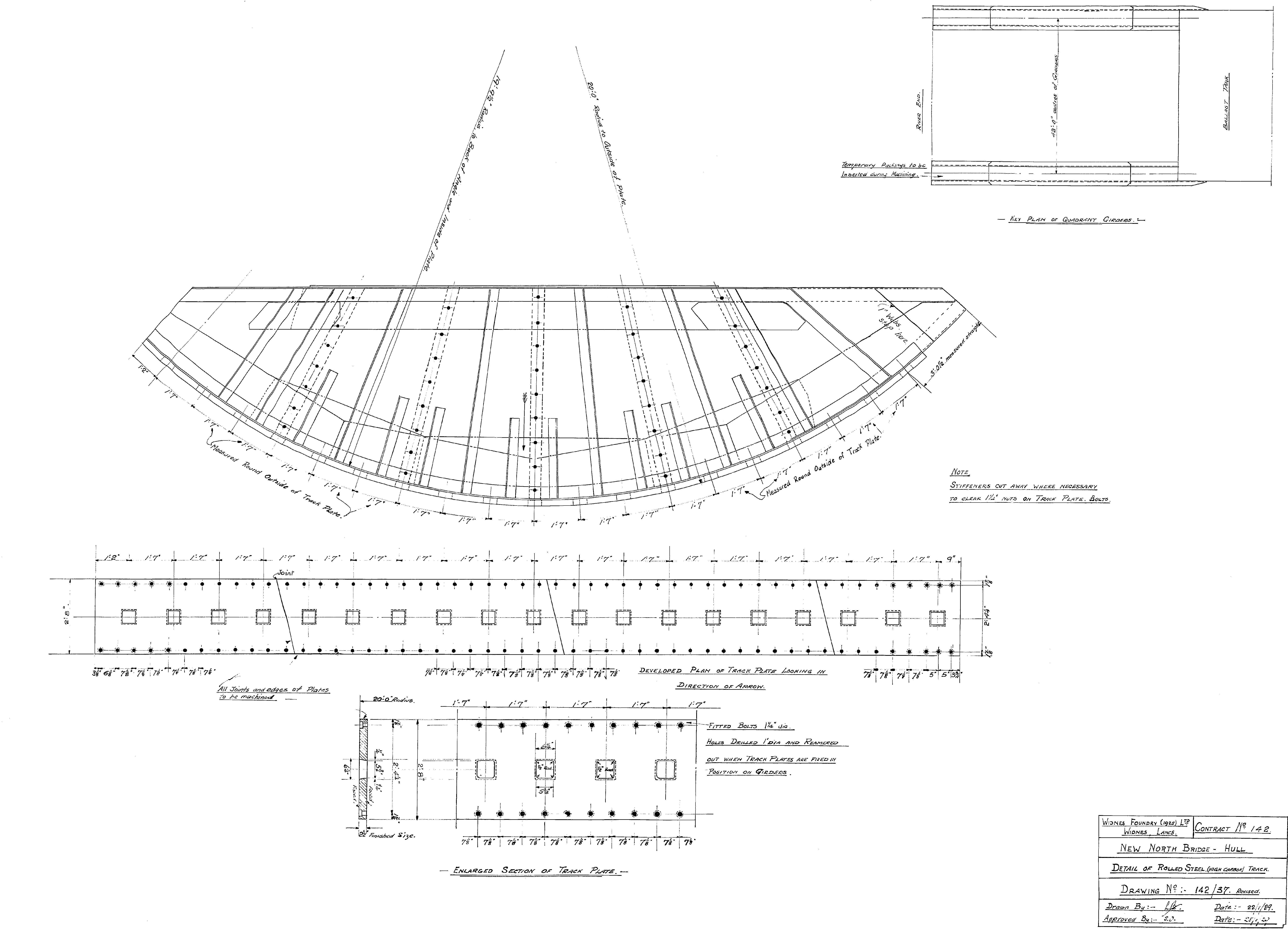 The photographs below the plans show the bridge from 1930 to 2017. The photograph above is the River Hull looking between the girders of Drypool Bridge towards North Bridge House and a closed North Bridge in 2005, by Bernard Sharp.