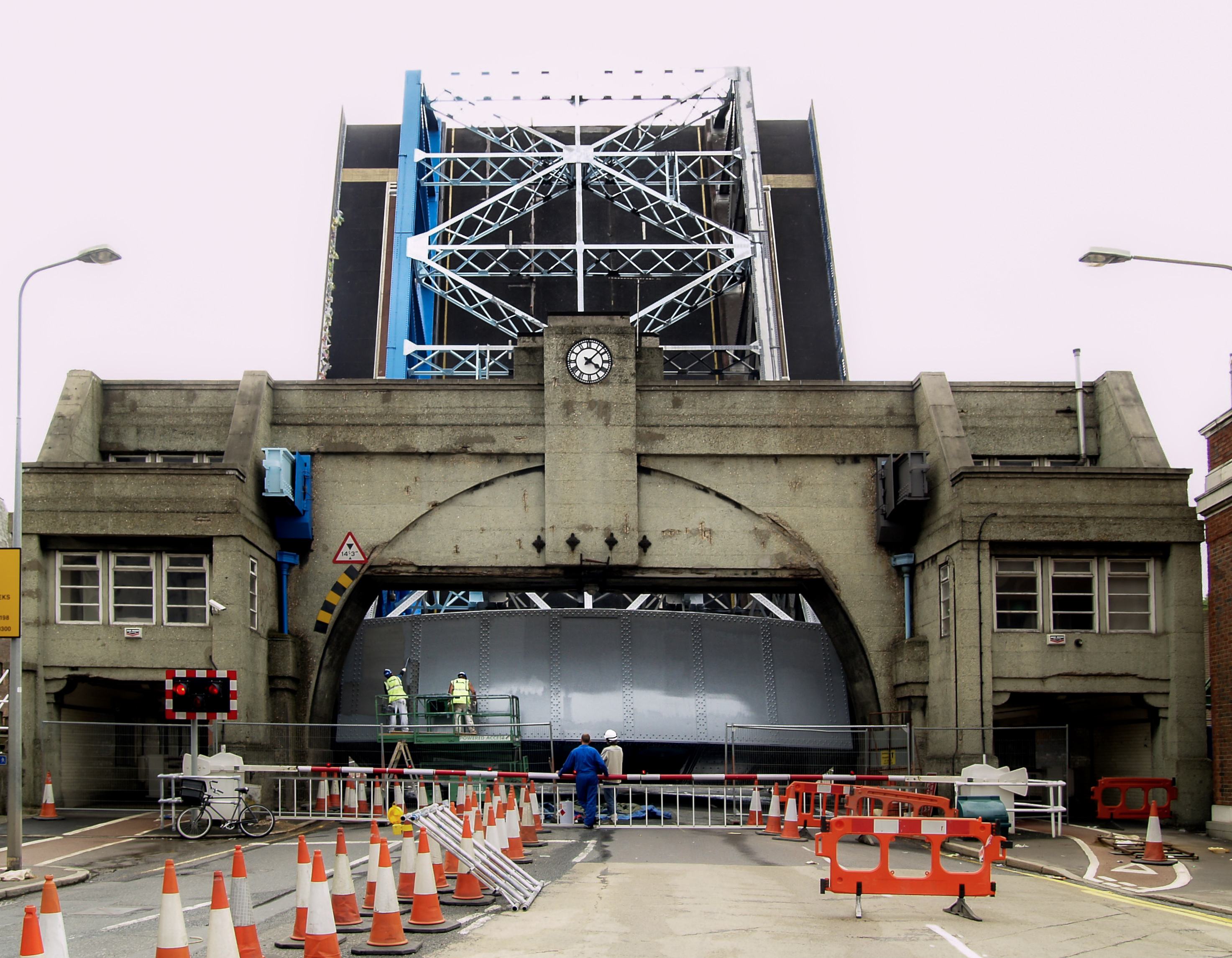North Bridge is a Scherzer rolling bascule bridge, designed by City Engineer, T Thomas in 1927, built by the Widnes Foundry (1925) Ltd., with Sculcoates firm Sangwin contracted for the tramway. It opened on Monday 10th August 1931, for motor transport, trams and foot crossings.