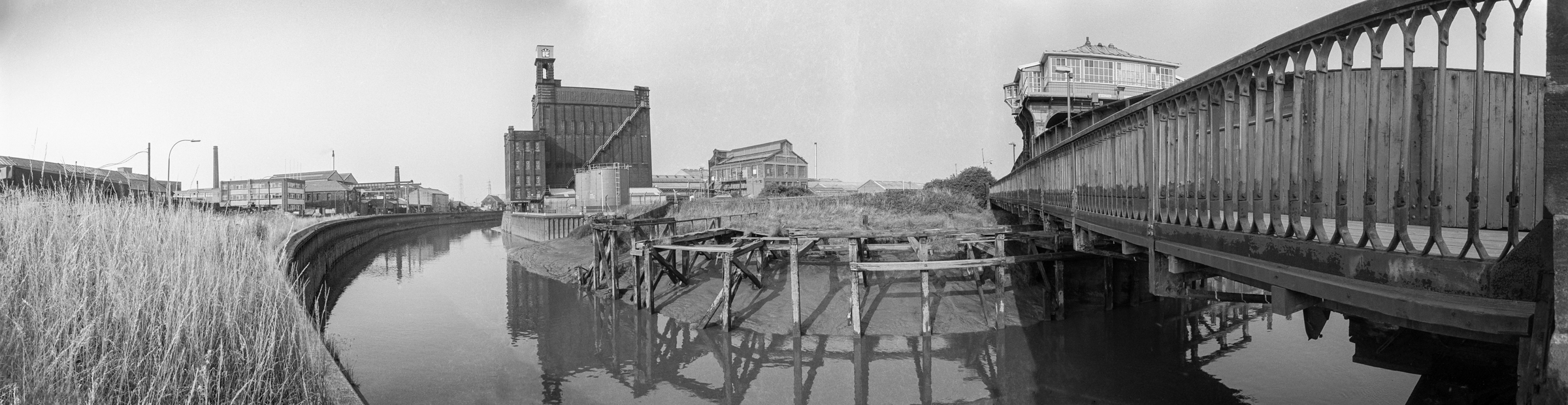 I made a series a series of five images which together covering a 360 degree view from a position close to the end of the bridge. These were of course taken on film; in Hull, 1983 digital images hardly existed and were generally crude and pixelated – or even made up of ANSI characters, and I don’t think digital image stitching software existed as there was nothing for it to stitch. I intended not to produce a single panoramic image but a series of images that would be mounted in sequence with a small gap between them.