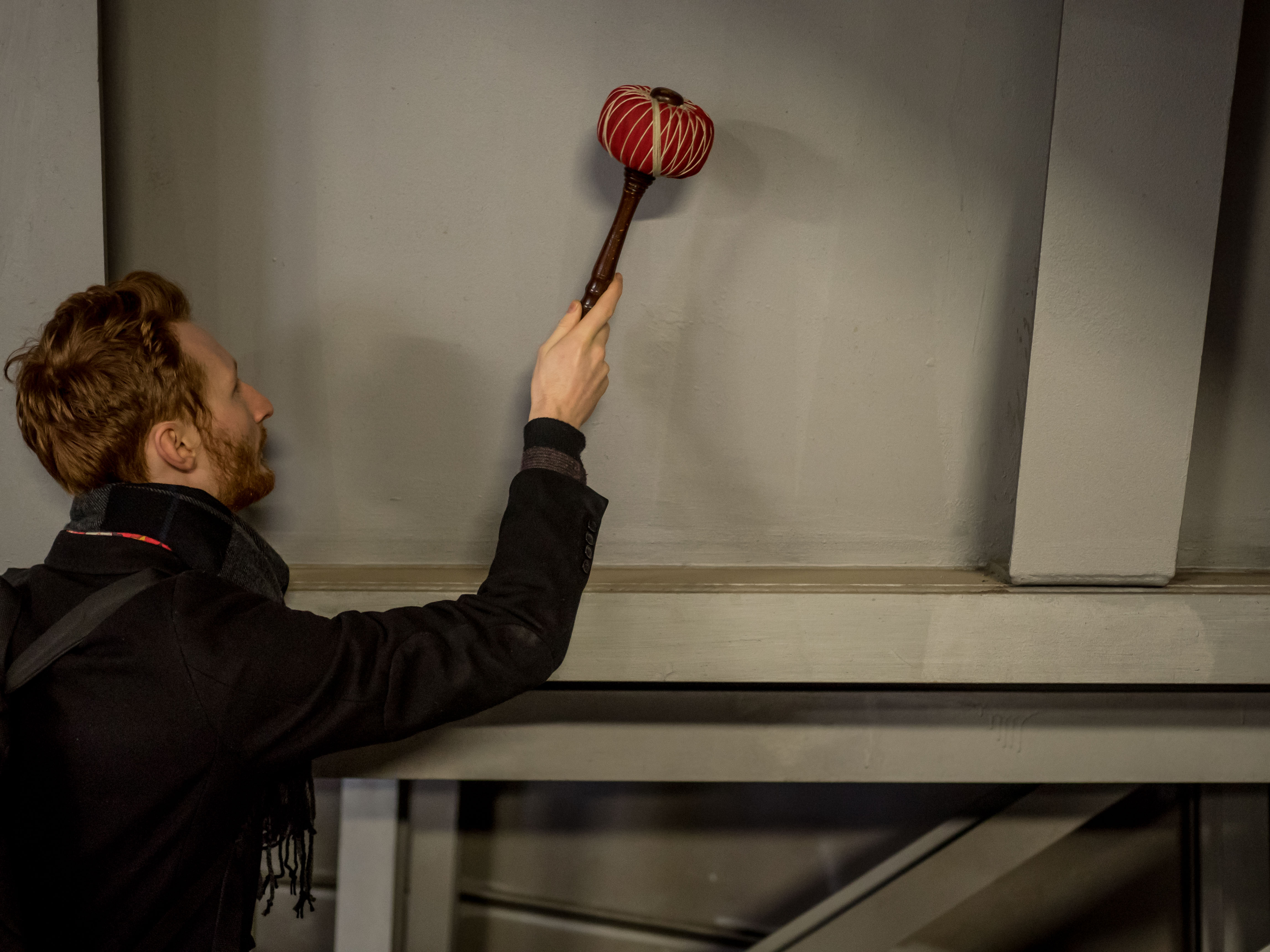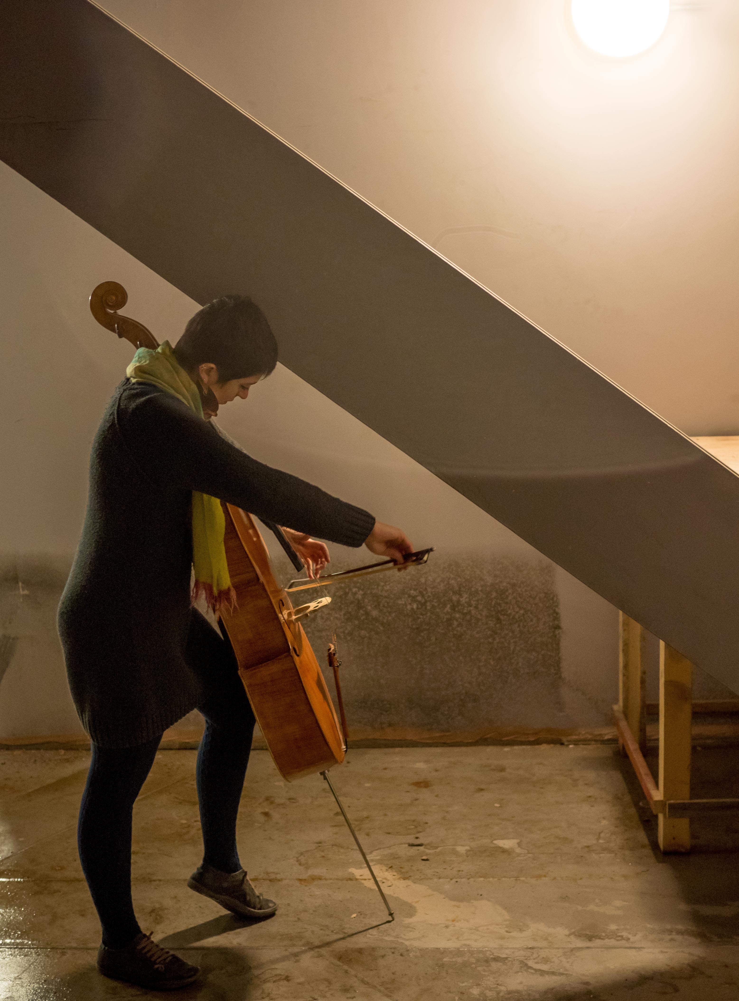 Big gong sounds using huge metal panels from inside & outside the chamber created a metallic rhythmic pulse which merged into the drones of cellos, viola, harmonium, wind instruments and bridge parts that built into huge ominous crescendos and diminished to delicate hums. The musicians moved around the space and continued to play as they left the chamber where the piece closed with the deep resonant sound of the largest Gamelan gong, the gong ageng.