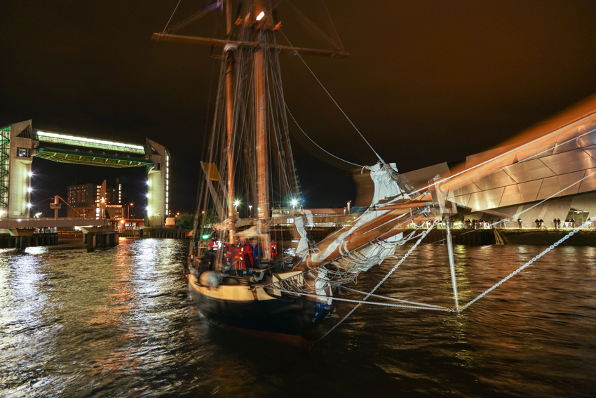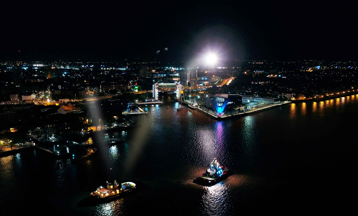 Kingston upon Hull, East Yorkshire has 13 bridges over the River Hull which flows north to south through the centre of the city and out into the Humber. No other city has so many opening bridges over such a short stretch of navigable river. Open Bridges was a logistical first, the culmination of 18 months of meticulous planning and preparation. Open Bridges is a celebration of the lifeblood of the city delivered by an all Hull based team to manage the different elements. On the night historic vessels representing three centuries mustered on the River Hull to be met out on the Humber estuary by powerful 21st century tugs. The world premiere of the new acousmatic composition ‘Moments in Time’ by BAFTA award winning composer John Stead was especially commissioned for Open Bridges, featuring sounds recorded from Hull bridges and diffused in octophonic sound. Historic vessels representing three centuries mustered on the River, all together for the first time, to be met on the Humber by powerful 21st century tugs.