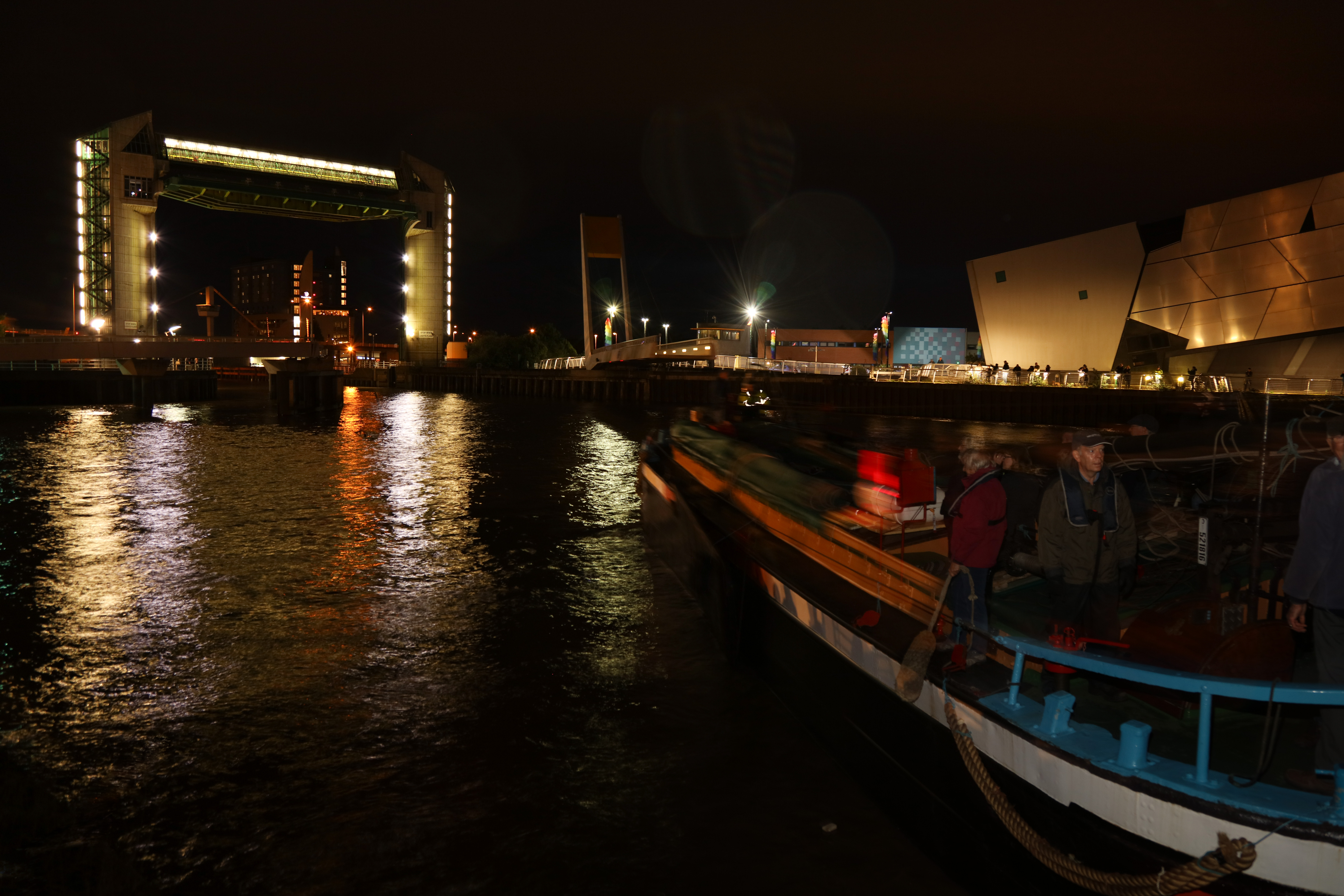 There were so many adventures during Open Bridges, and everyone who was part of it had a different story to tell. While the Motor Barge Syntan sailed down the River Hull HMS Pickle and Humber Keel Comrade – with Humber Rescue on the river – prepared to meet where the river flows into the Humber estuary. Then, at 20:17 hours on the autumn equinox 2017 all 13 of Hull’s river bridges closed to traffic, separating the city into two for the first time in its history. HMS Pickle fired 13 rockets into the night sky to mark the moment. The vessels sailed out into the estuary to be met by the waiting, powerful Svitzer Maersk and SMS Towage tugs with searchlights and water canons. As the vessels disappeared into darkness the soundscape began.