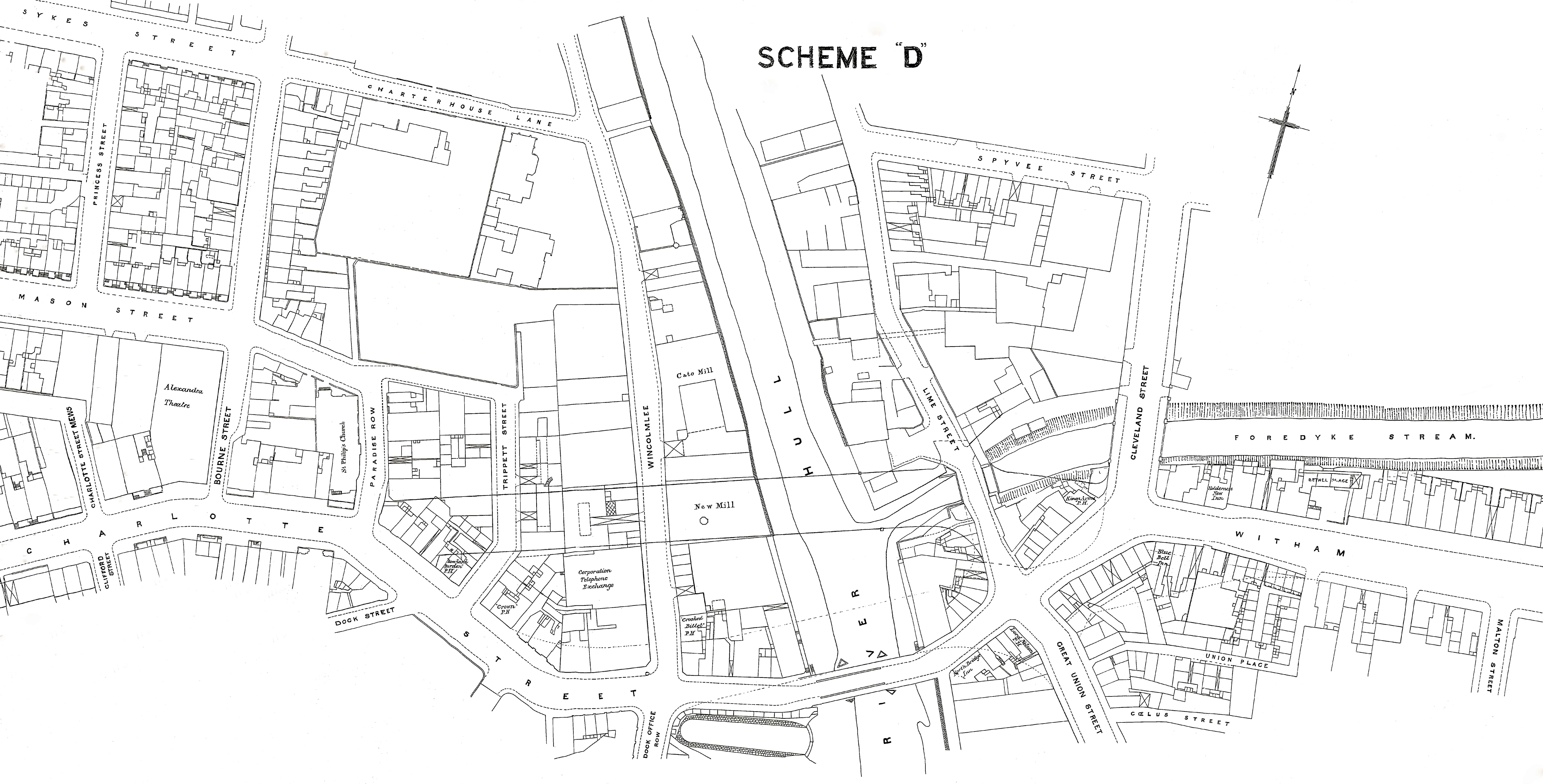 Sheme ‘D’ shows a map of the bridge in 1925 with the position of the proposed replacement bridge, pencilled in to the north.